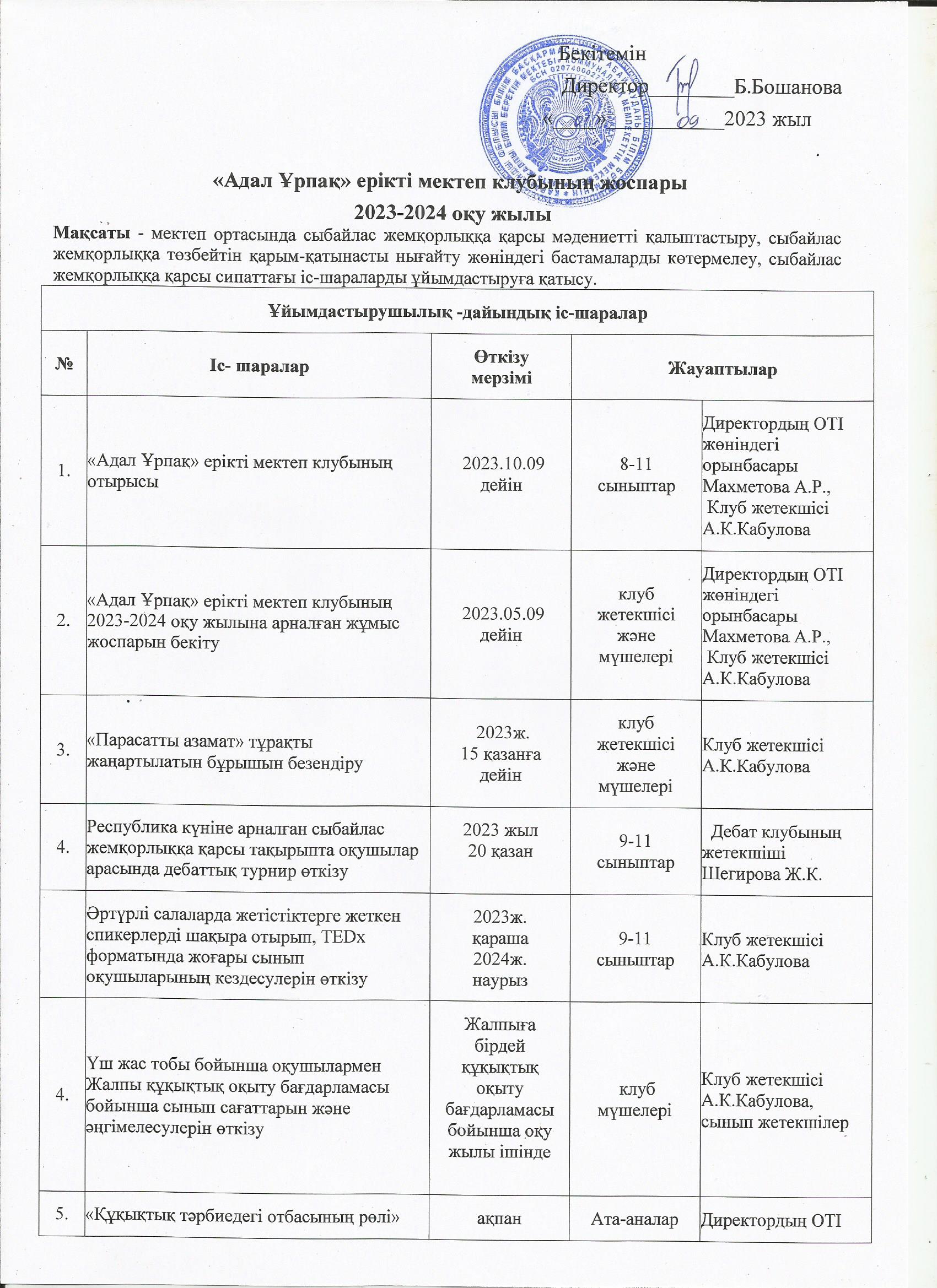 "Адал Ұрпақ" клубытың жоспары 2023-2024 оқу жылы"Адал Ұрпақ" еріктік мектеп клубытың жоспары 2023-2024 оқу жылы |
