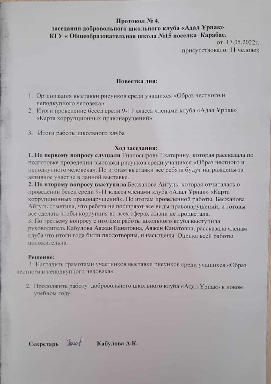 Заседания добровольного школьного клуба "Адал Ұрпақ"