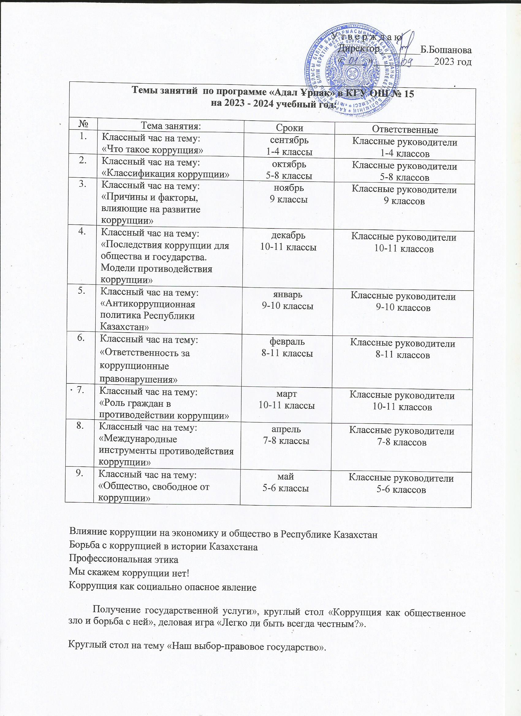 №15 ЖББМ "Адал Ұрпақ" бағдарламасы бойынша сабақ тақырыптары 2023-2024оқу жылы