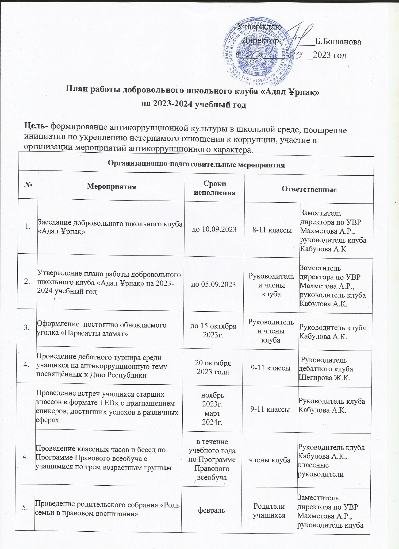 План работы добровольного школьного клуба "Адал Ұрпақ" на 2023-2024 учебный год