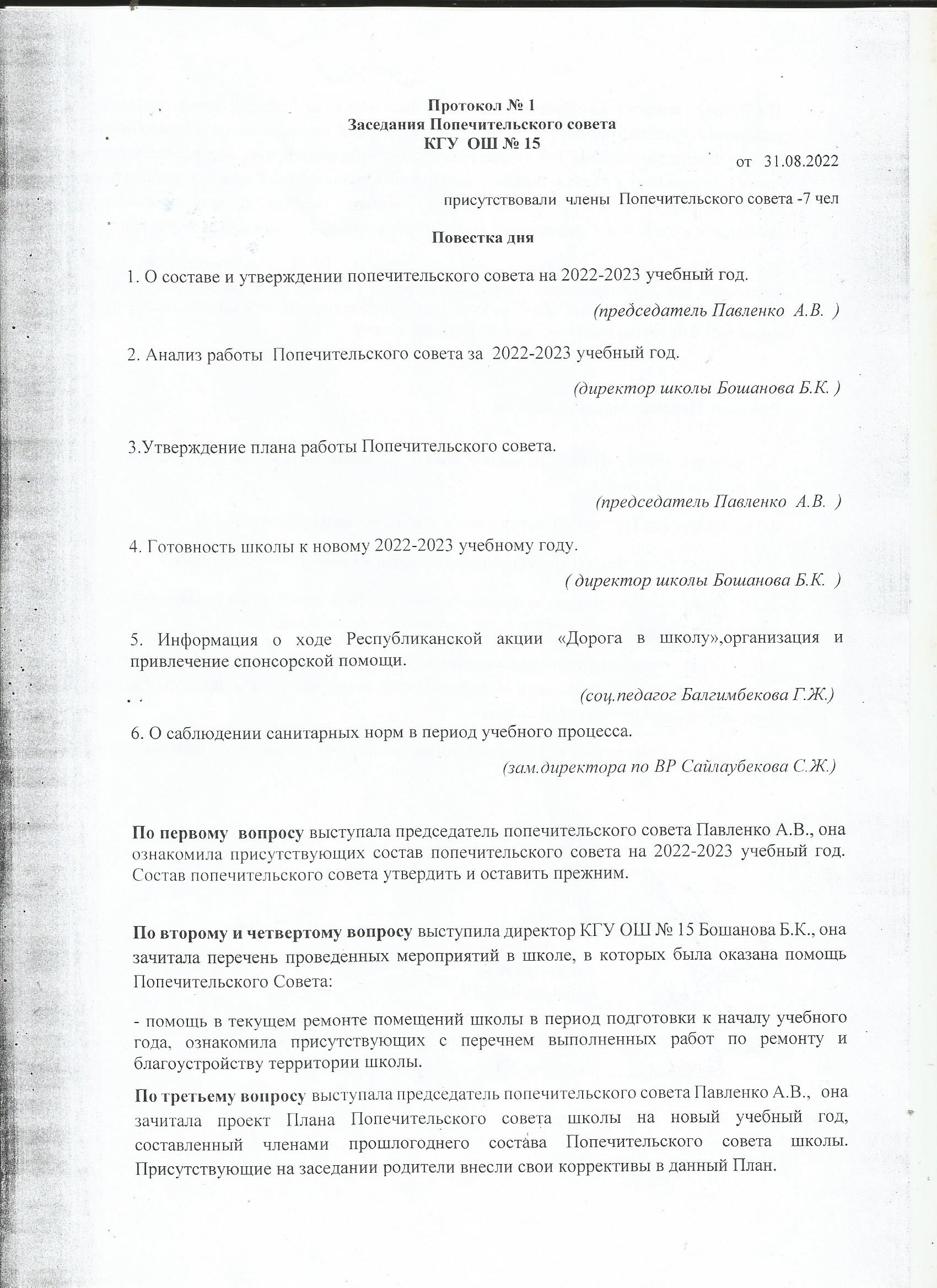 Протокол № 1Заседание Попечительского совета от 31.08.2022 года |