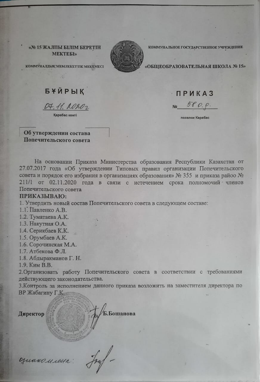 Приказ КГУ ОШ № 15Об утверждении состава Попечительского совета |