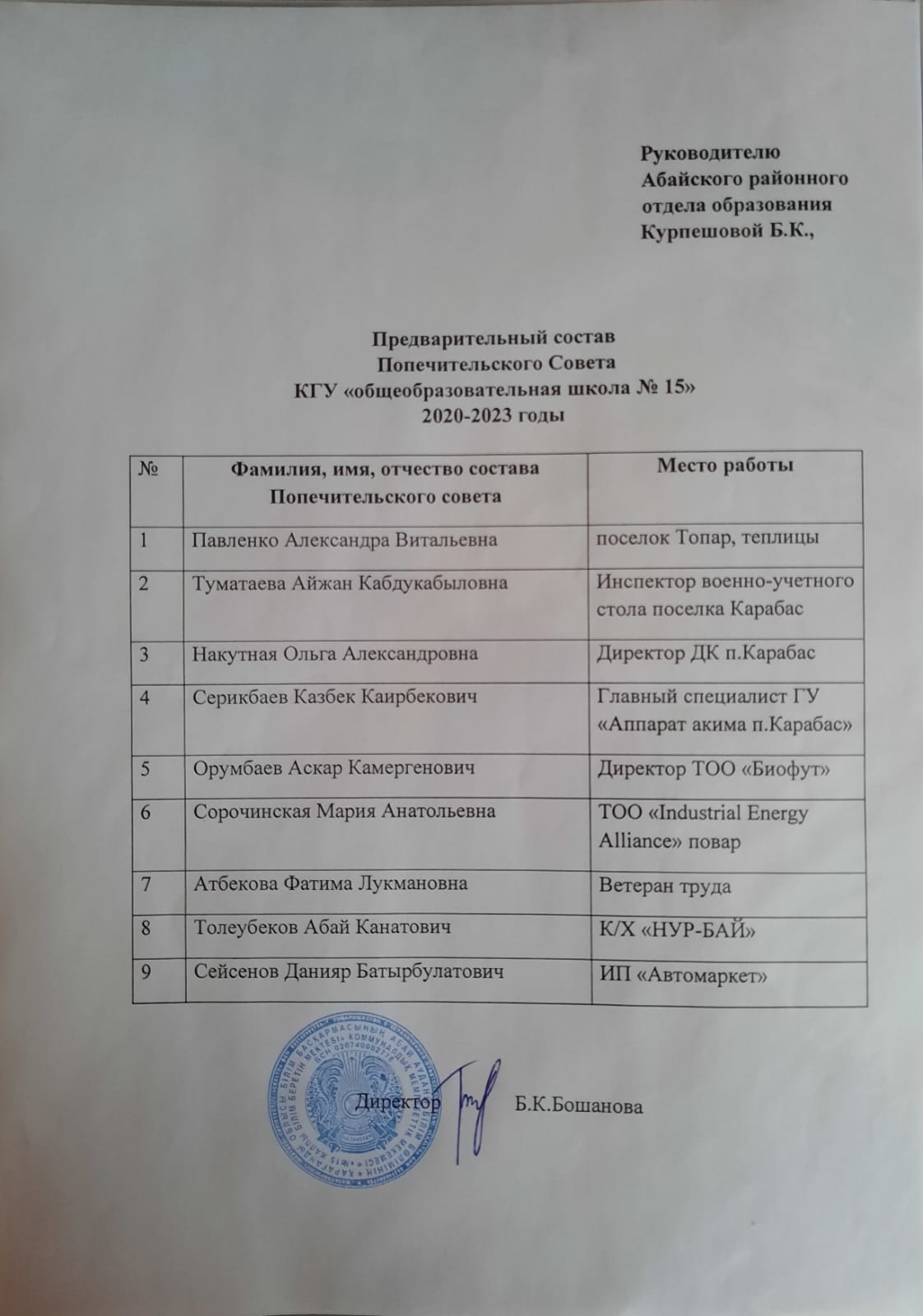 Предварительный состав Попечительского советаКГУ "Общеобразовательная школа № 15" 2020-2023 годы |