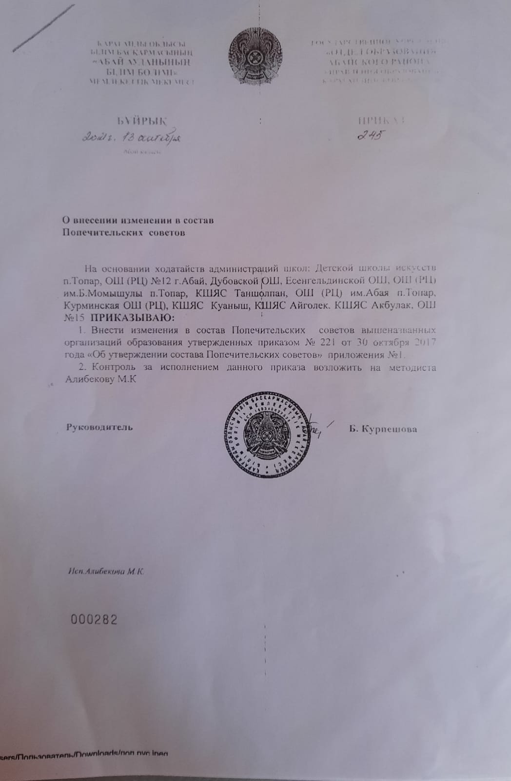 Приказ КГУ ОШ № 15Об утверждении состава Попечительского совета |