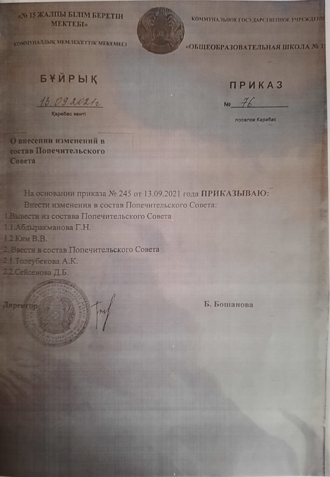 Приказ КГУ ОШ № 15 от 13.09.2021 годаО внесении изменений в состав Попечительского совета |