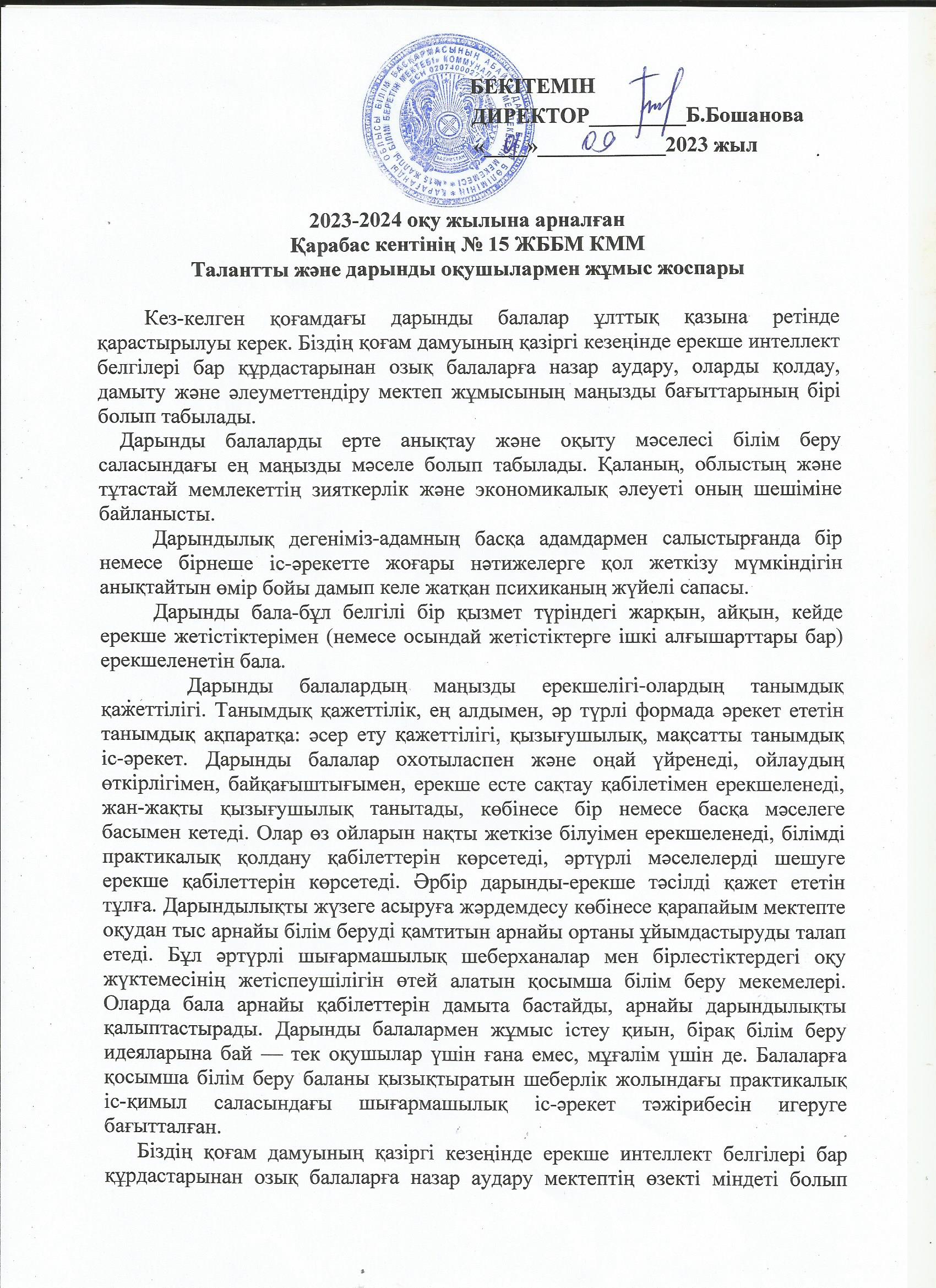 2023-2024 оқу жылына арналған Қарабас кентінің №15 ЖББМ КММ Талантты және дарынды оқушылармен жұмыс жоспарыДарынды балалармен жұмыс жоспары |