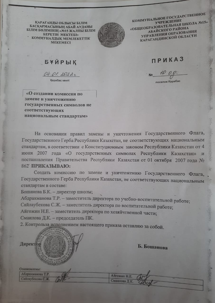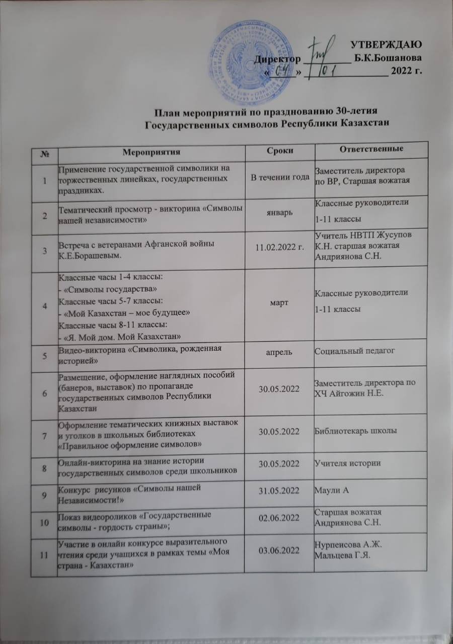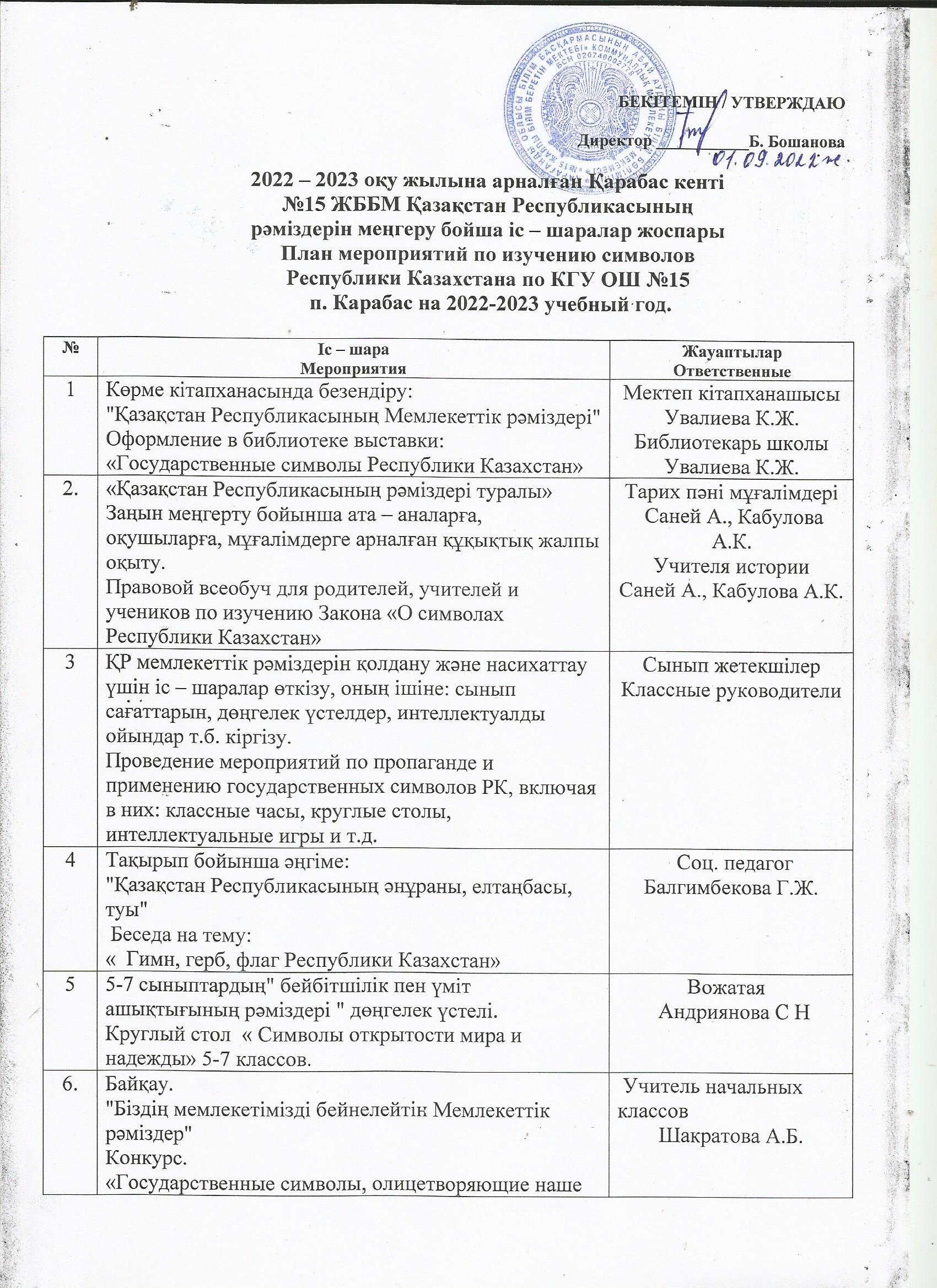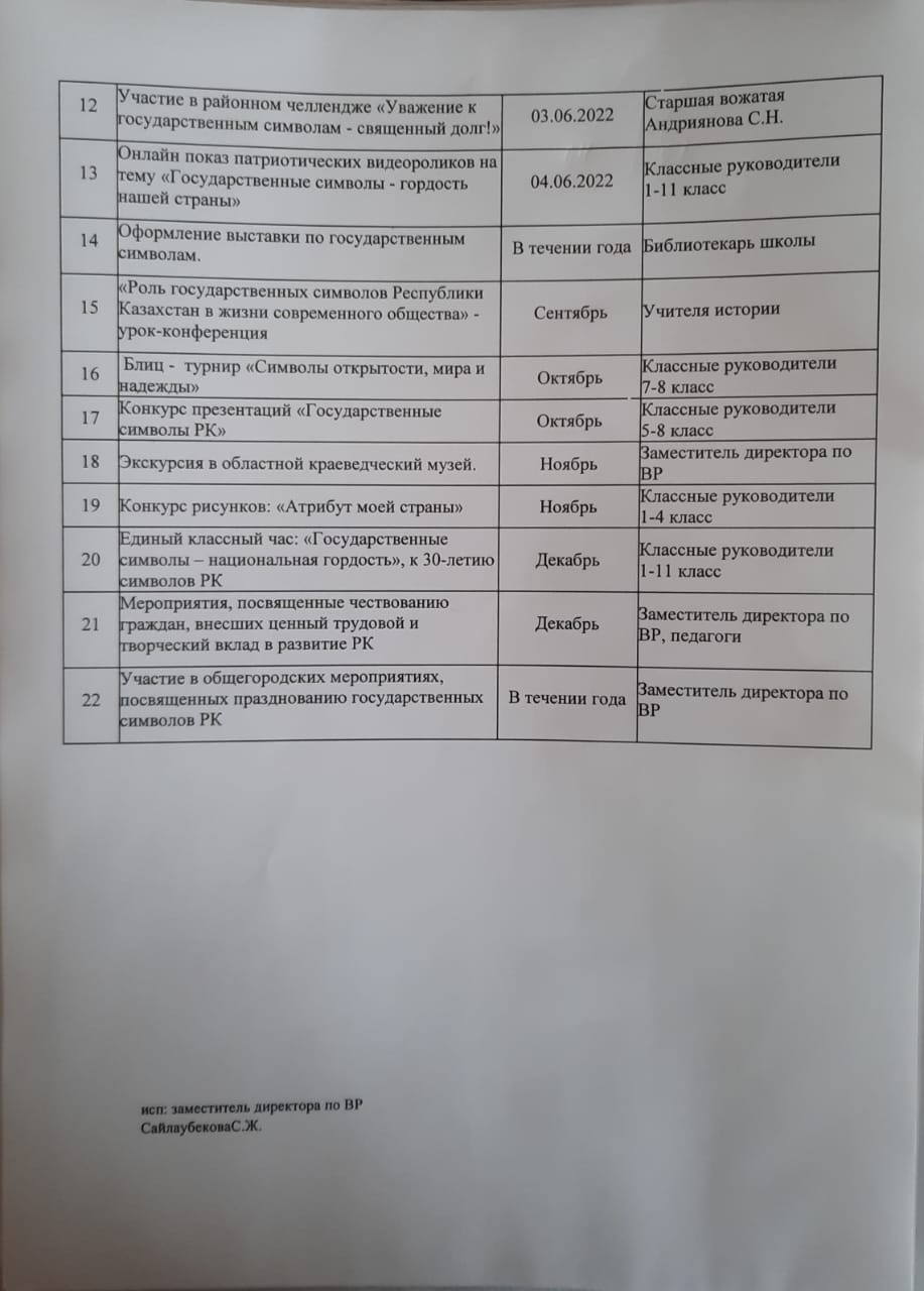 План мероприятий по изучению символов Республики Казахстан по КГУ ОШ №15