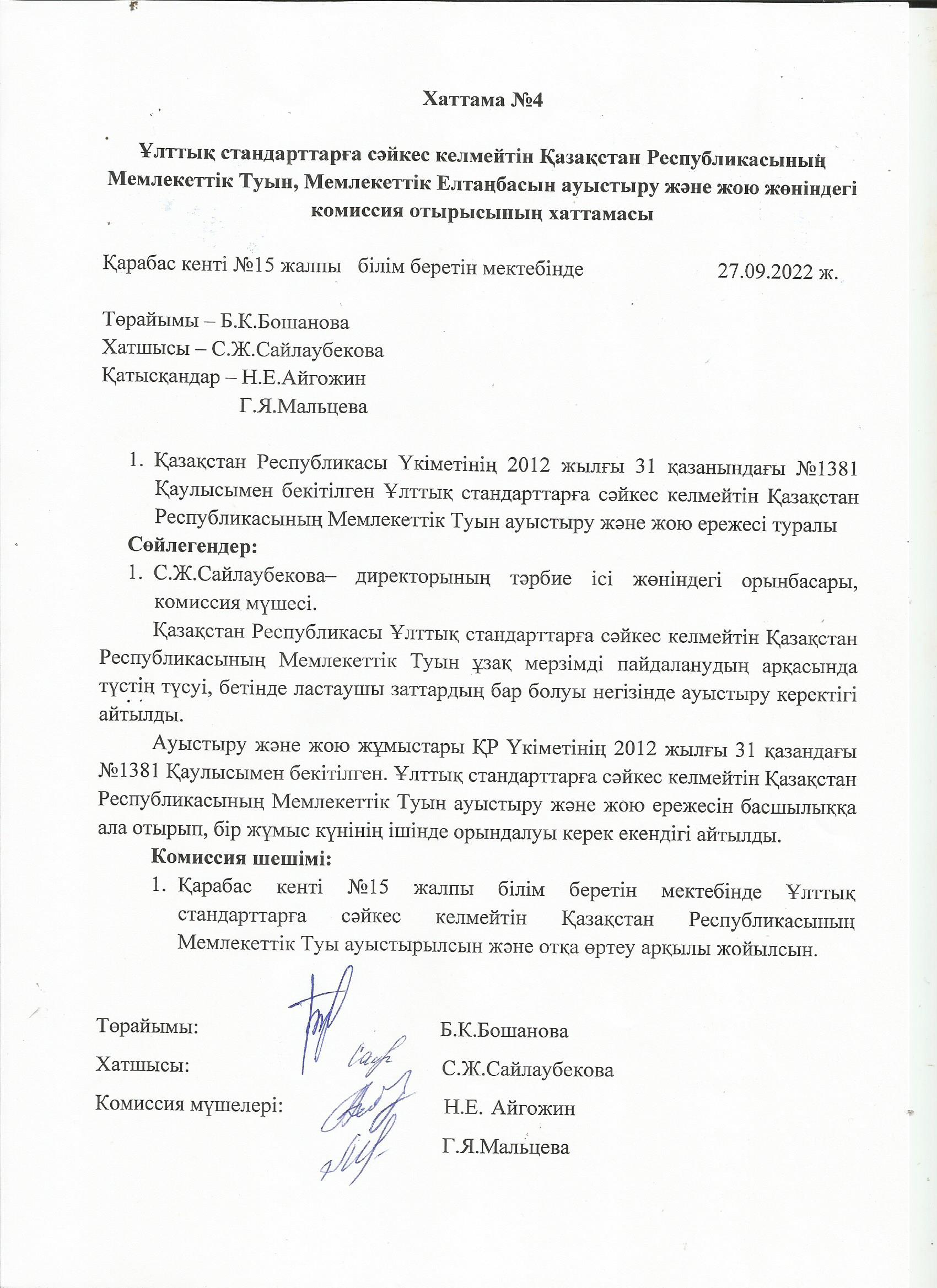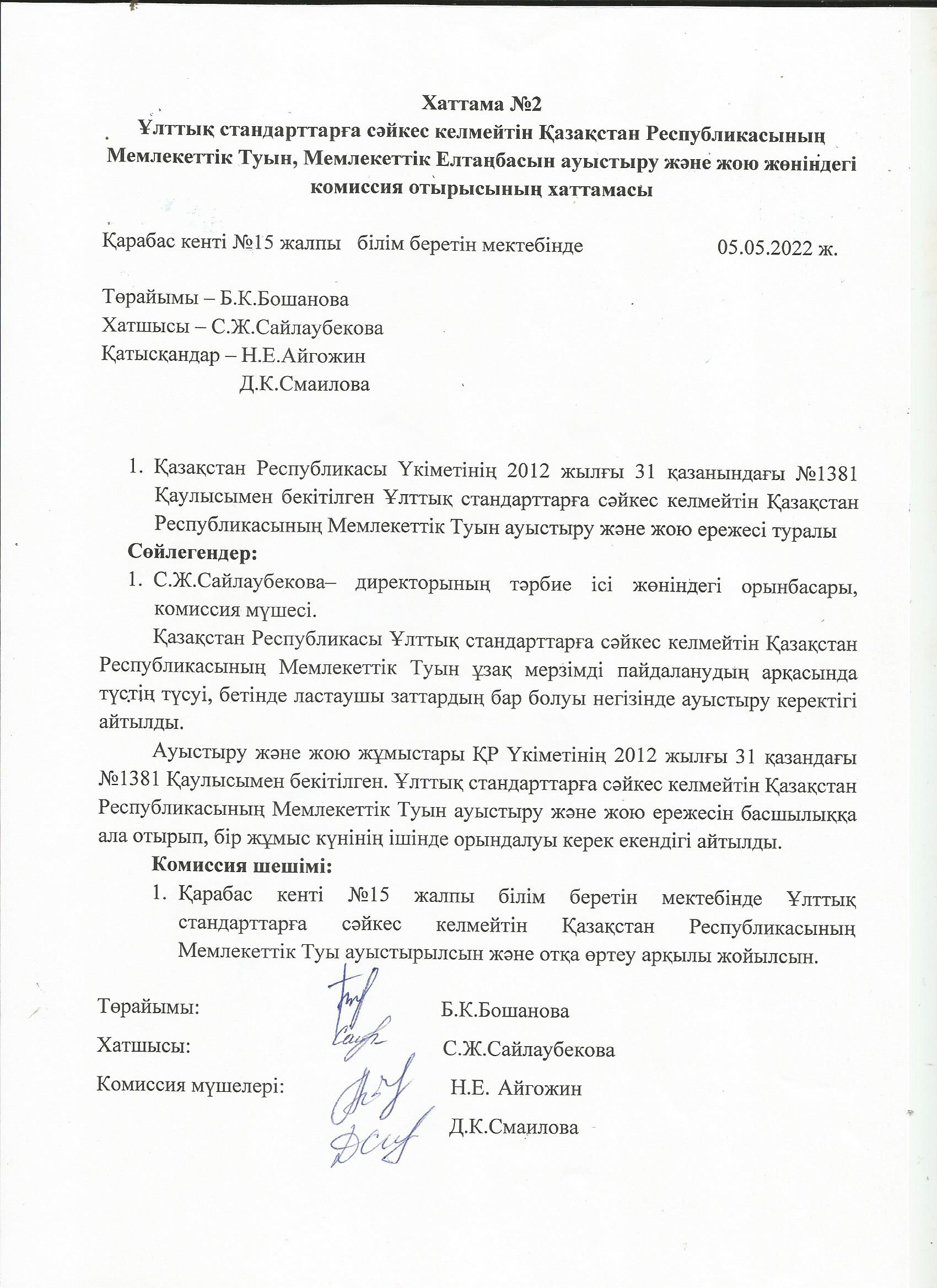 Ұлттық стандарттарға сәйкес келмейтін Қазақстан Республикасының Мемлекеттік Туын, Мемлекеттік Елтаңбасын ауыстыру және жою жөніндегі комиссия отырысының хаттамасы