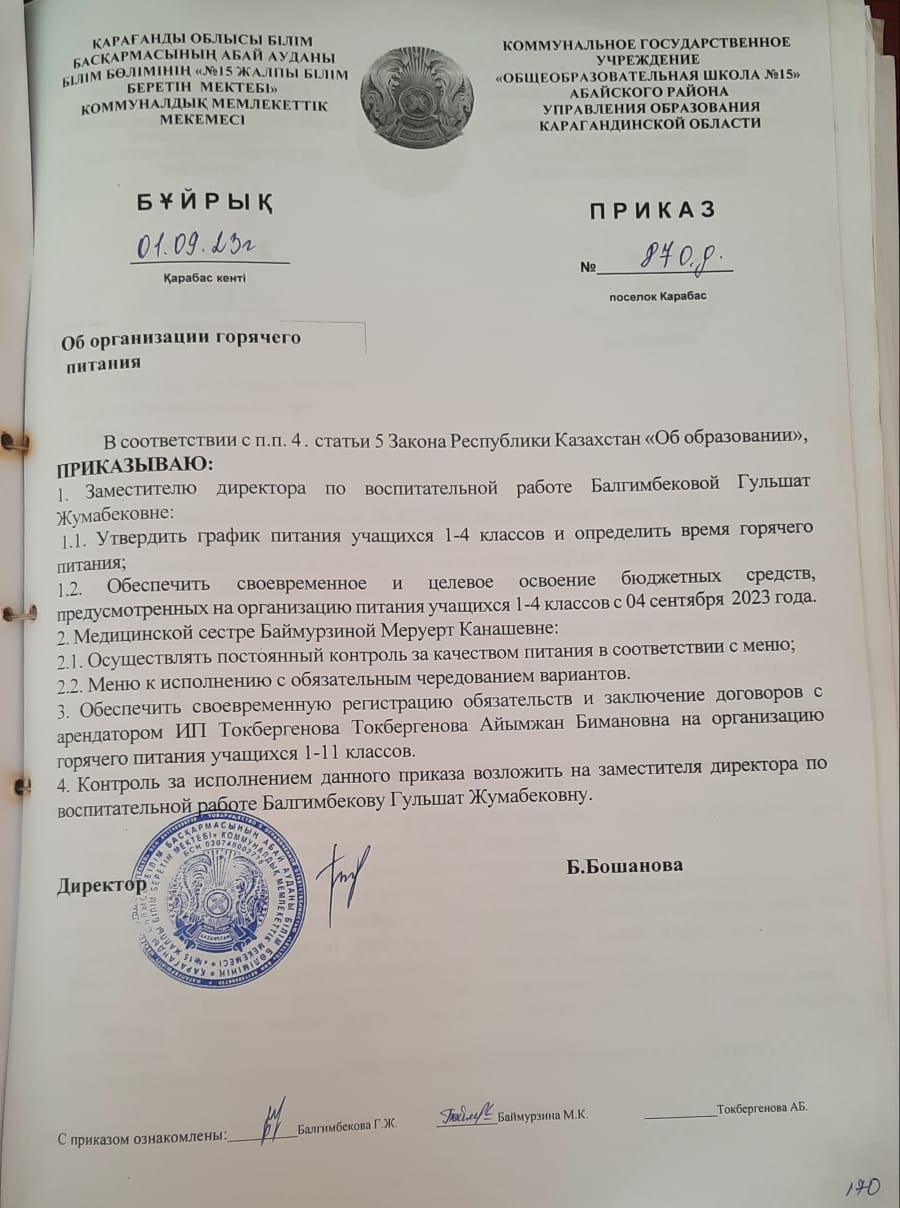 Приказ КГУ ОШ № 15О контроле за питанием 2022-2023 учебный год |