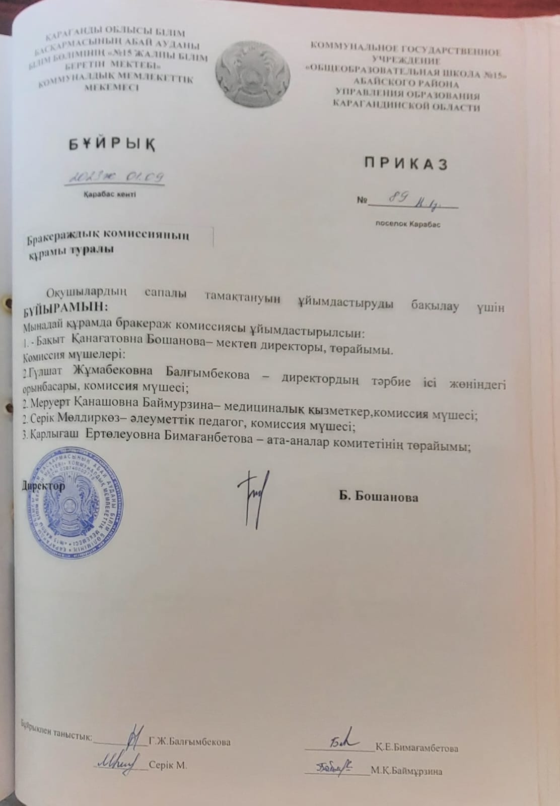 Бұйрық2023-2024 оқу жылына арналған бракераж комиссиясының құрамы туралы |