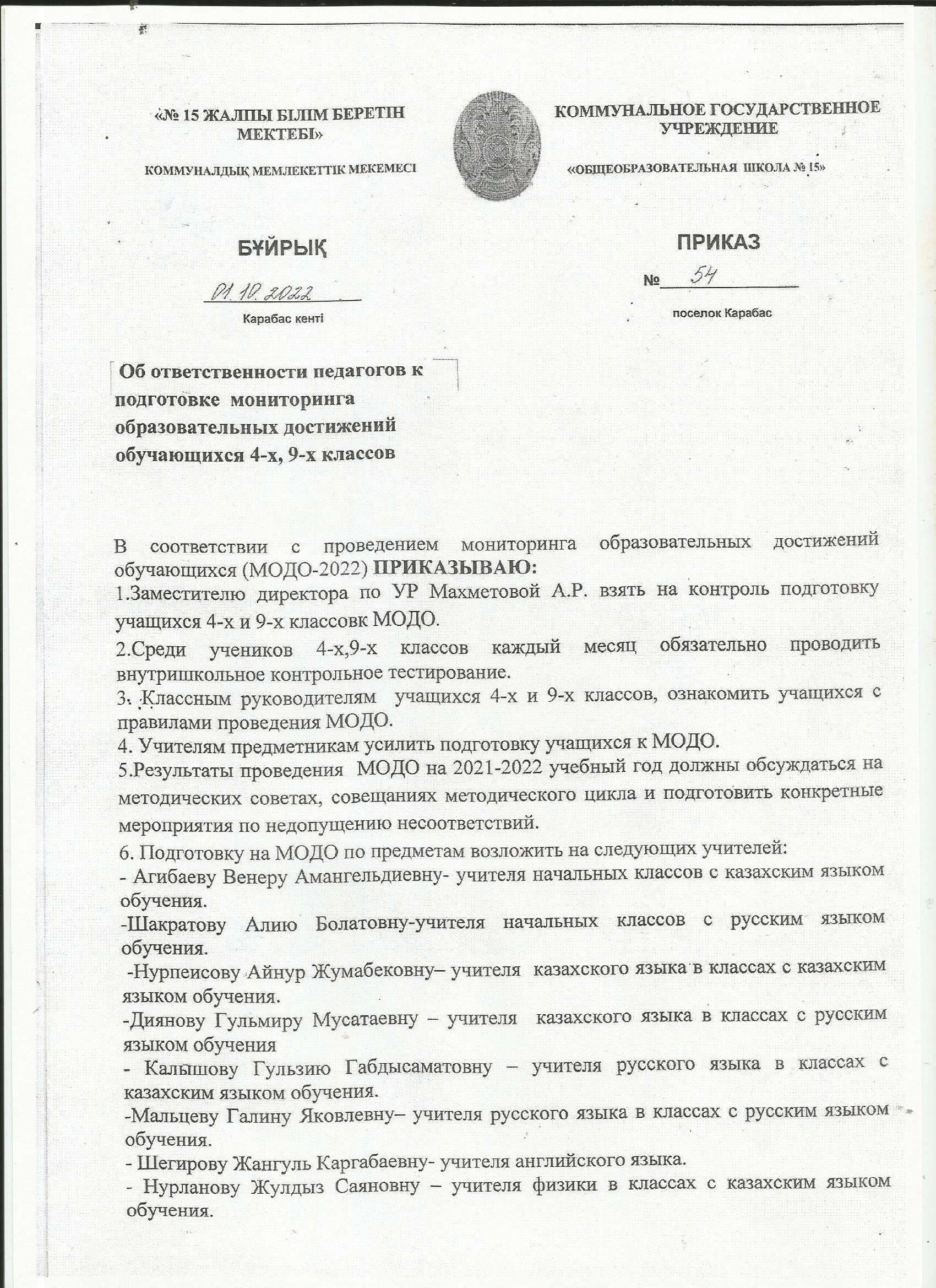 Приказ КГУ ОШ № 15 № 54 от 01.10.2022 годаОб ответственности педагогов к подготовке мониторинга образовательных достижений обучающихся 4-х, 9-х классов стр.1 |