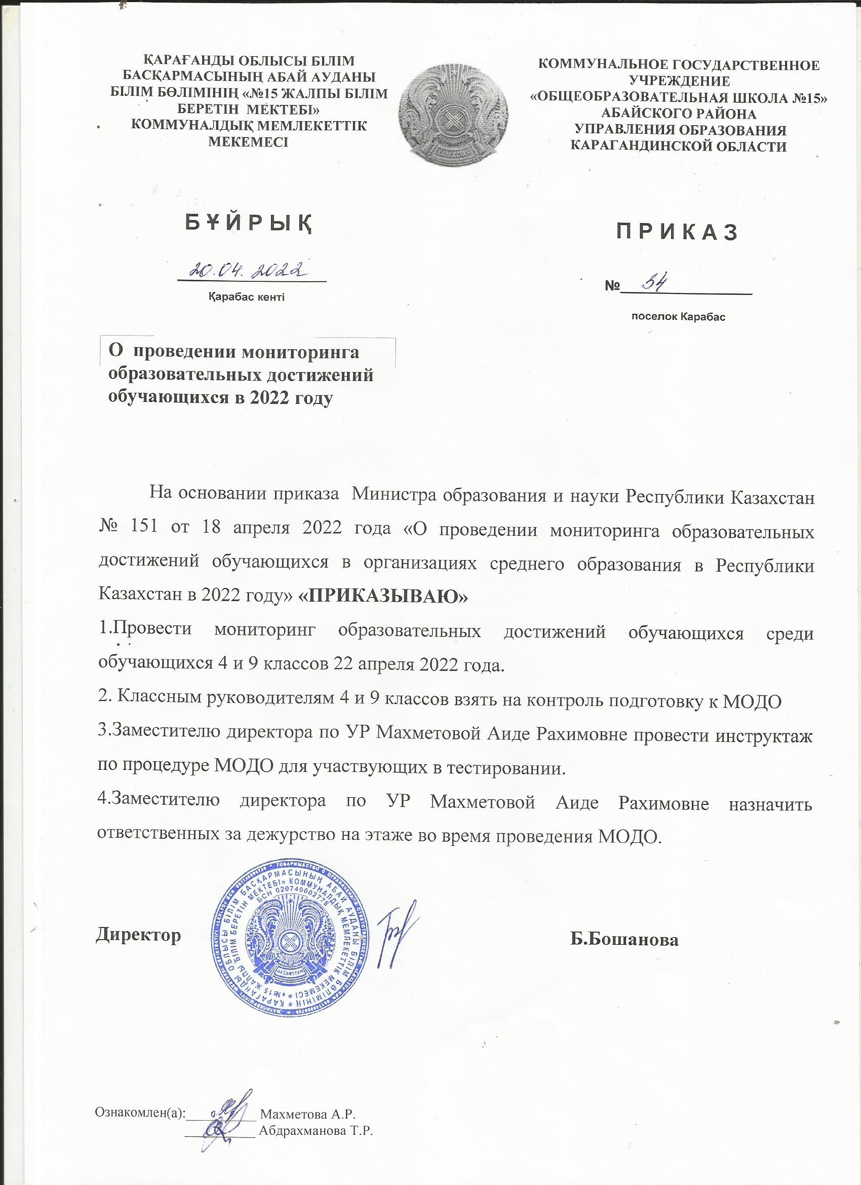 Приказ КГУ ОШ № 15 № 34 от 20.04.2022 годаО проведении мониторинга образовательных достижений обучающихся в 2022 году |
