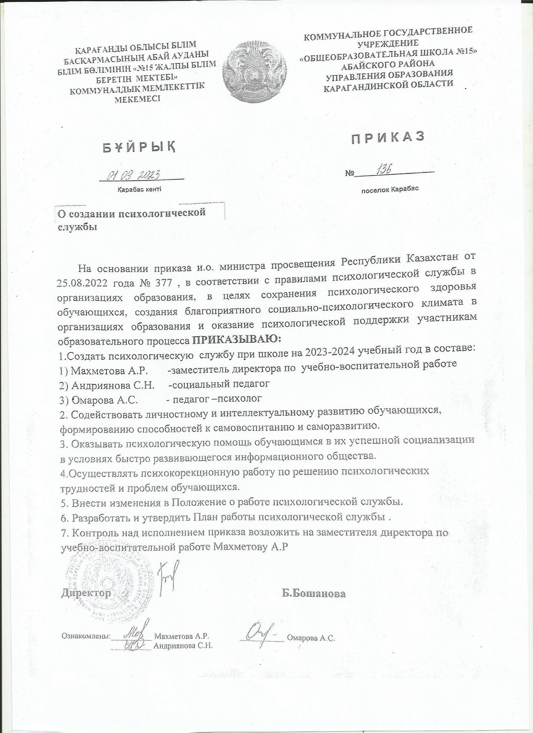 О создании психологической службы в КГУ ОШ 15№136 от 01.09.2023 год |