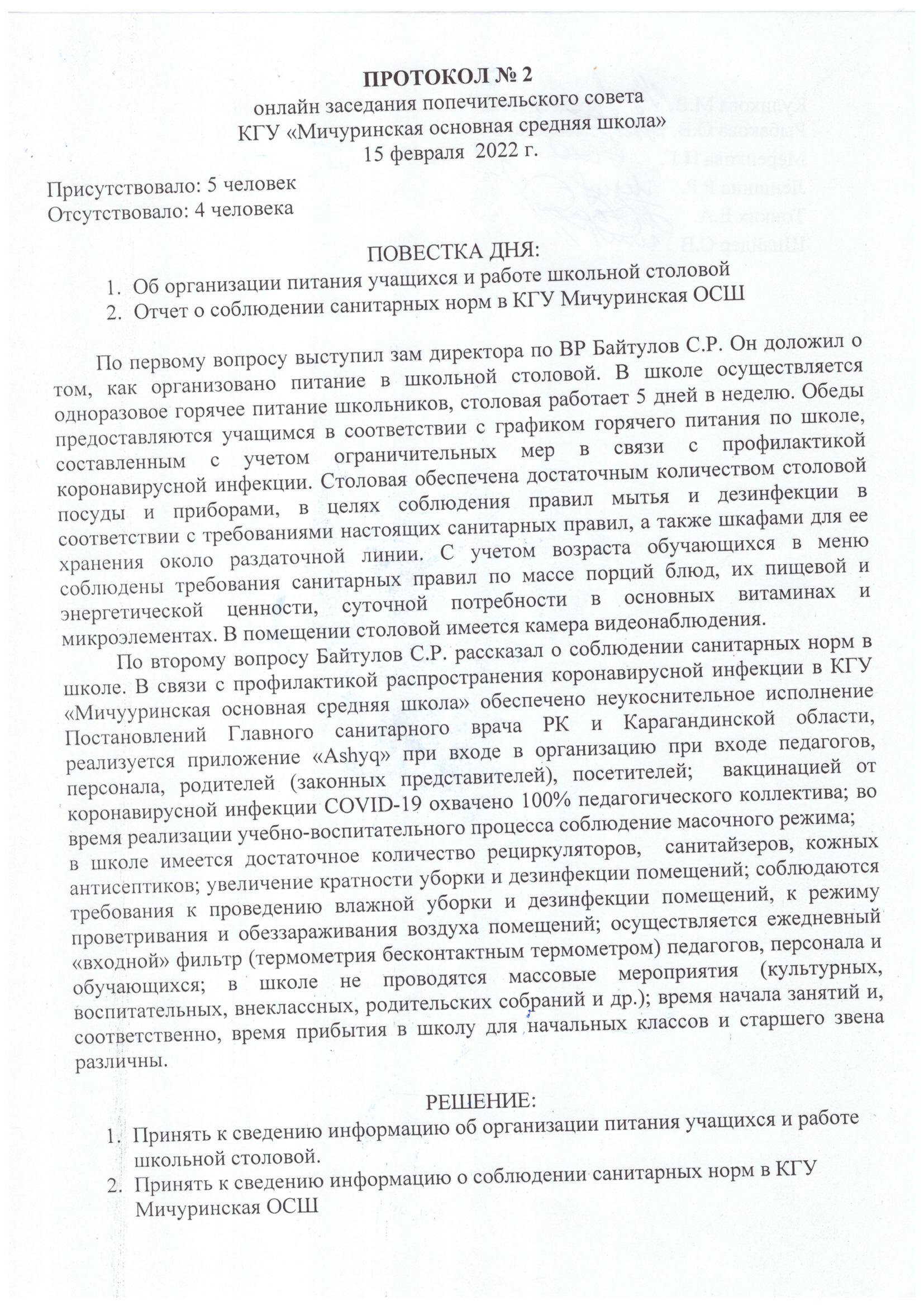 Протокол №2 от 15 февраля 2022 годаПротокол №2 онлайн заседания Попечительского Совета "КГУ Мичуринская ОСШ 15 февраля 2022 года |
