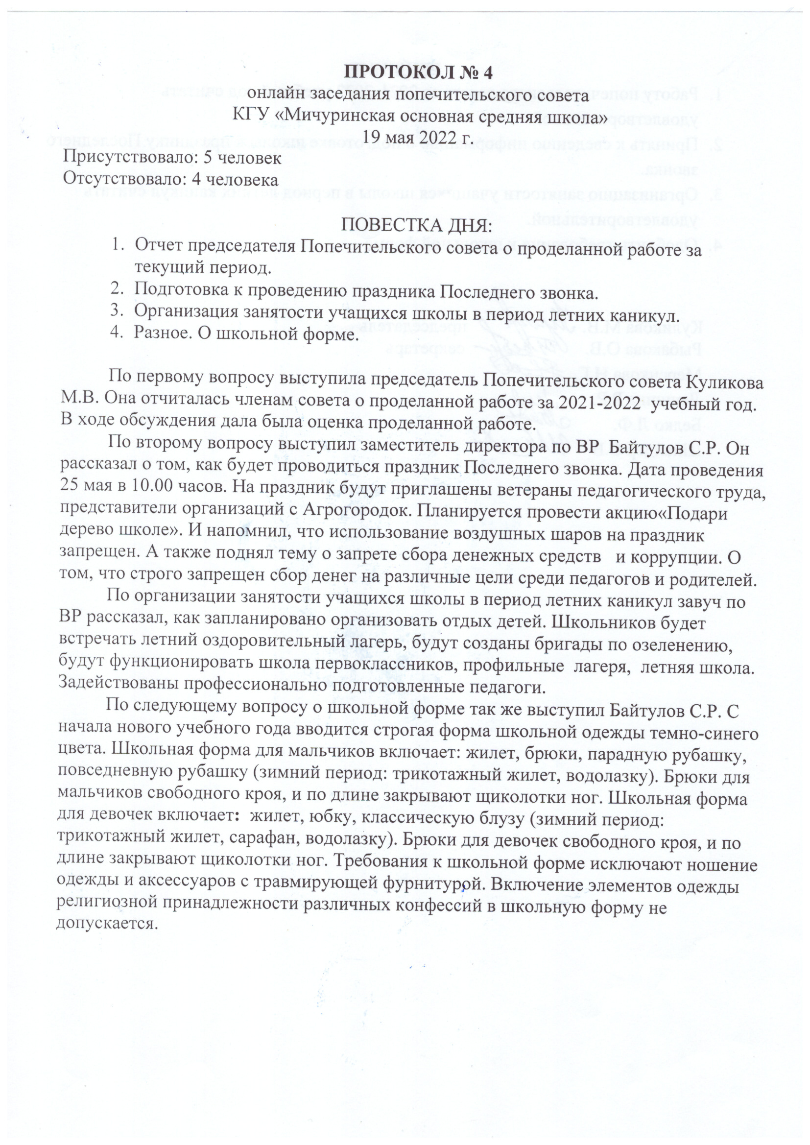 Протокол №4 от 19 мая 2022 годаПротокол №4 онлайн заседания Попечительского Совета "КГУ Мичуринская ОСШ 19 мая 2022 года |
