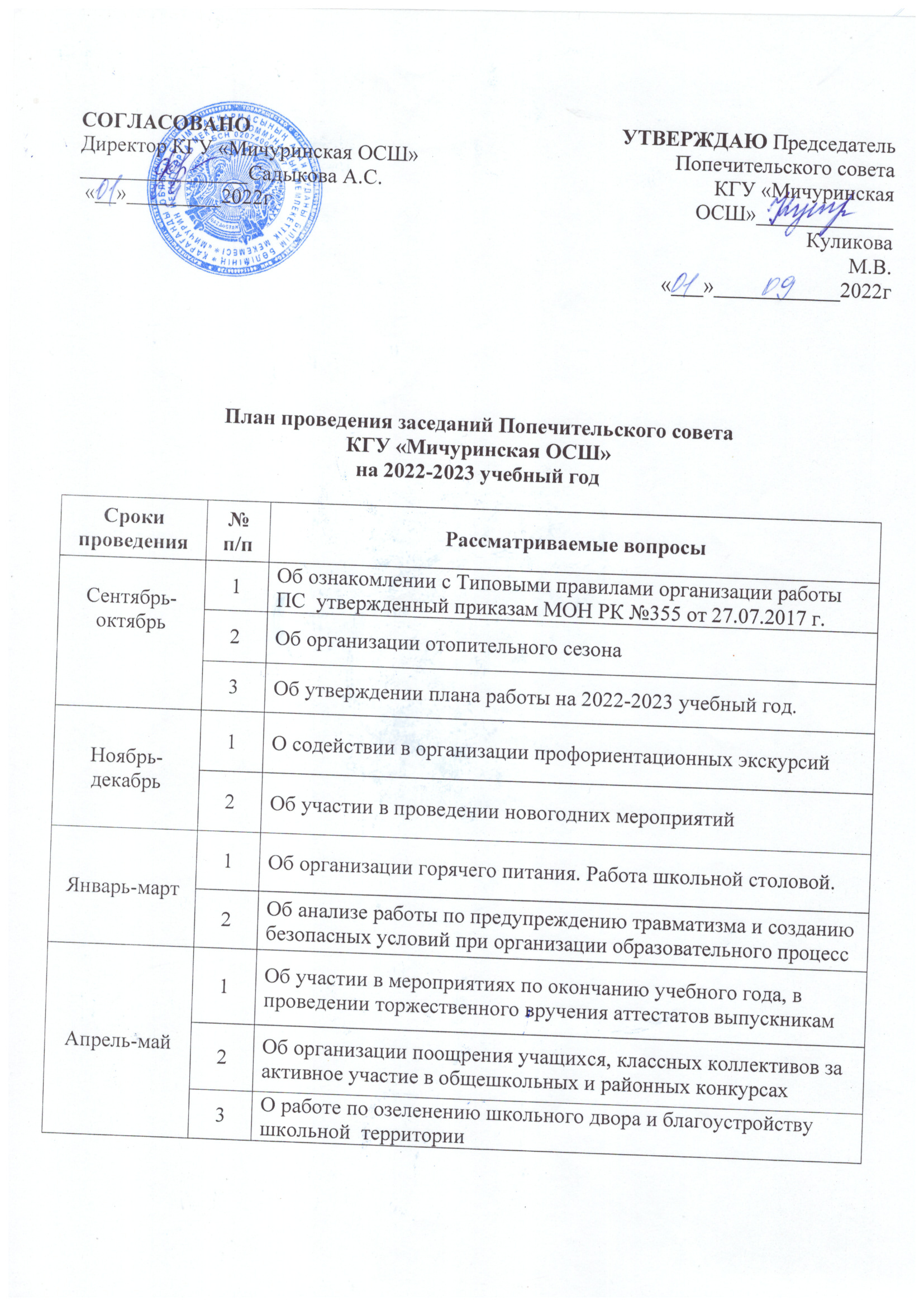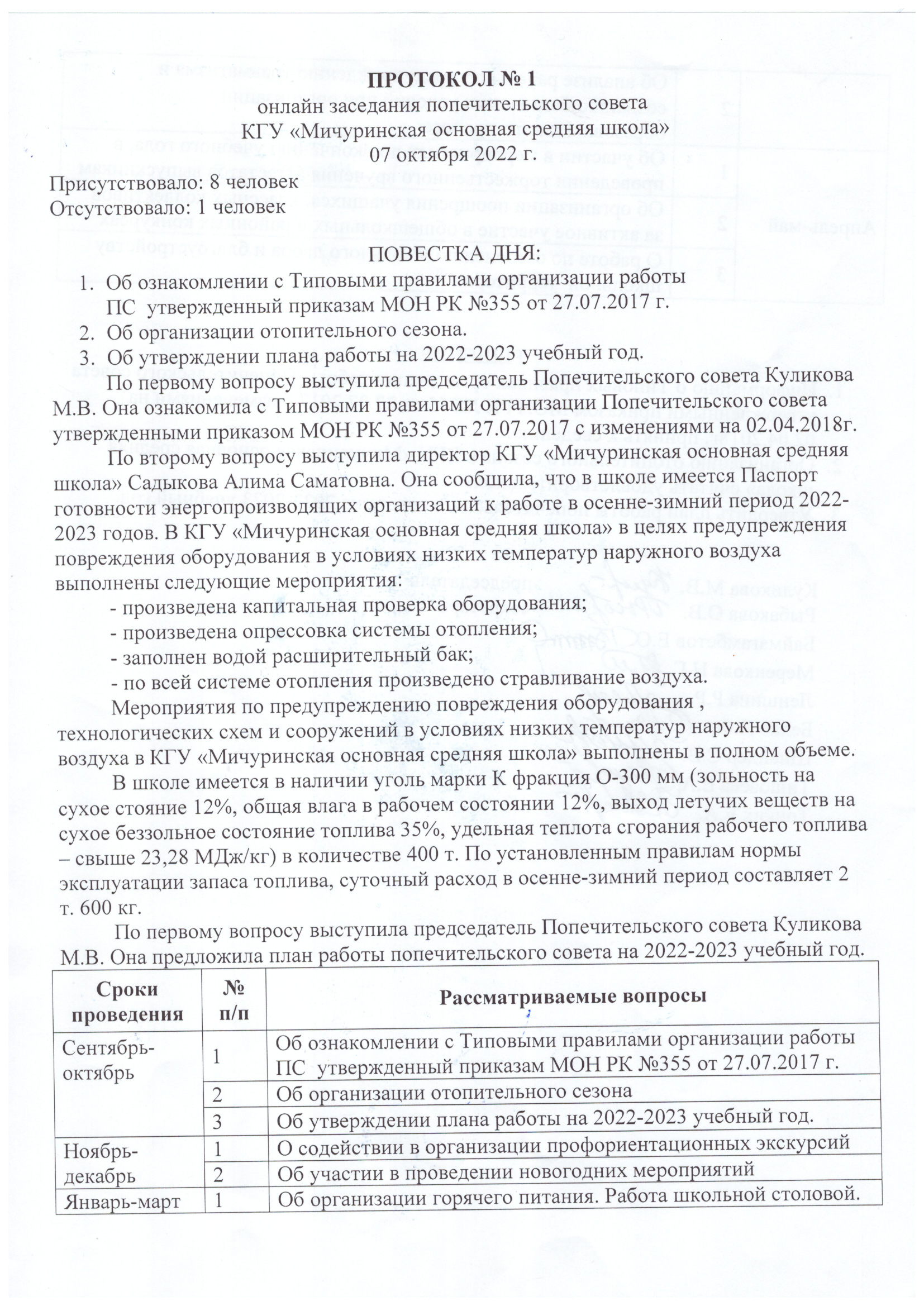 Протокол №1 от 07 октября 2022 годаПротокол №1 онлайн заседания Попечительского Совета "КГУ Мичуринская ОСШ 07 октября 2022 года |
