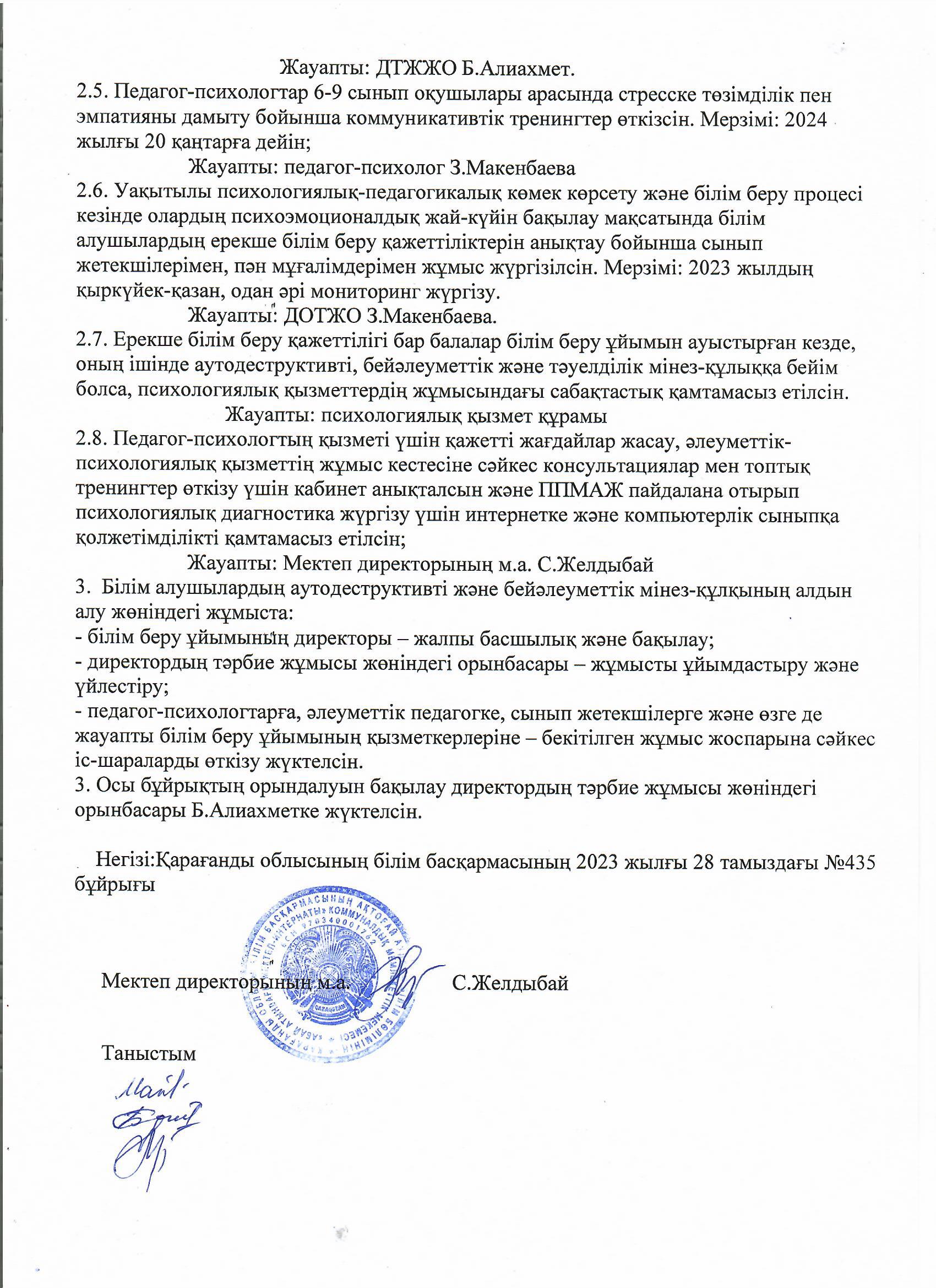 Кәмелетке толмағандар арасында аутодеструктивті жүріс-тұрыстың алдын алу бойынша іс-шаралар жоспарын жүзеге асыру туралыаутодеструктивті жүріс-тұрыстың алдын алу бұйрық |