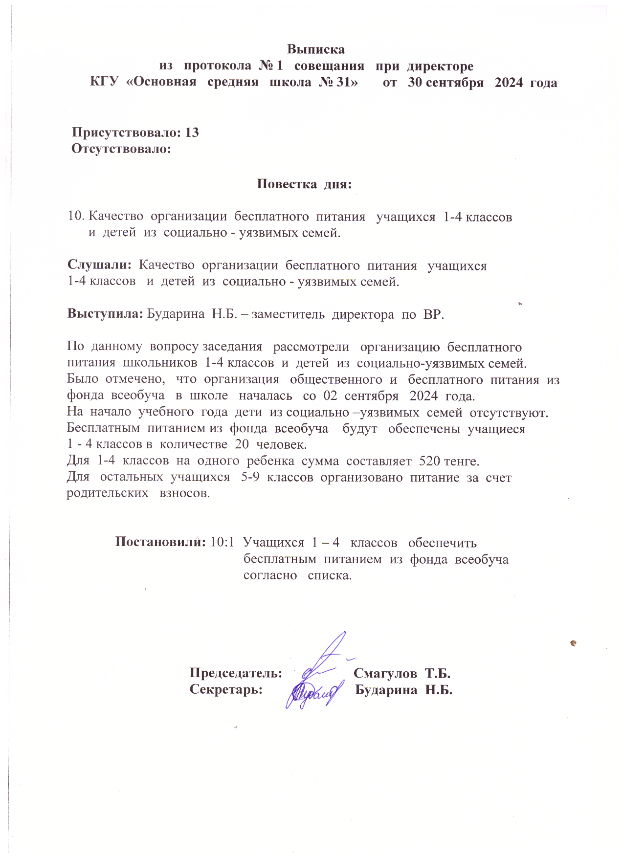 выписка из протокола №1 совещания при директоре от 30.09.2024 года рус