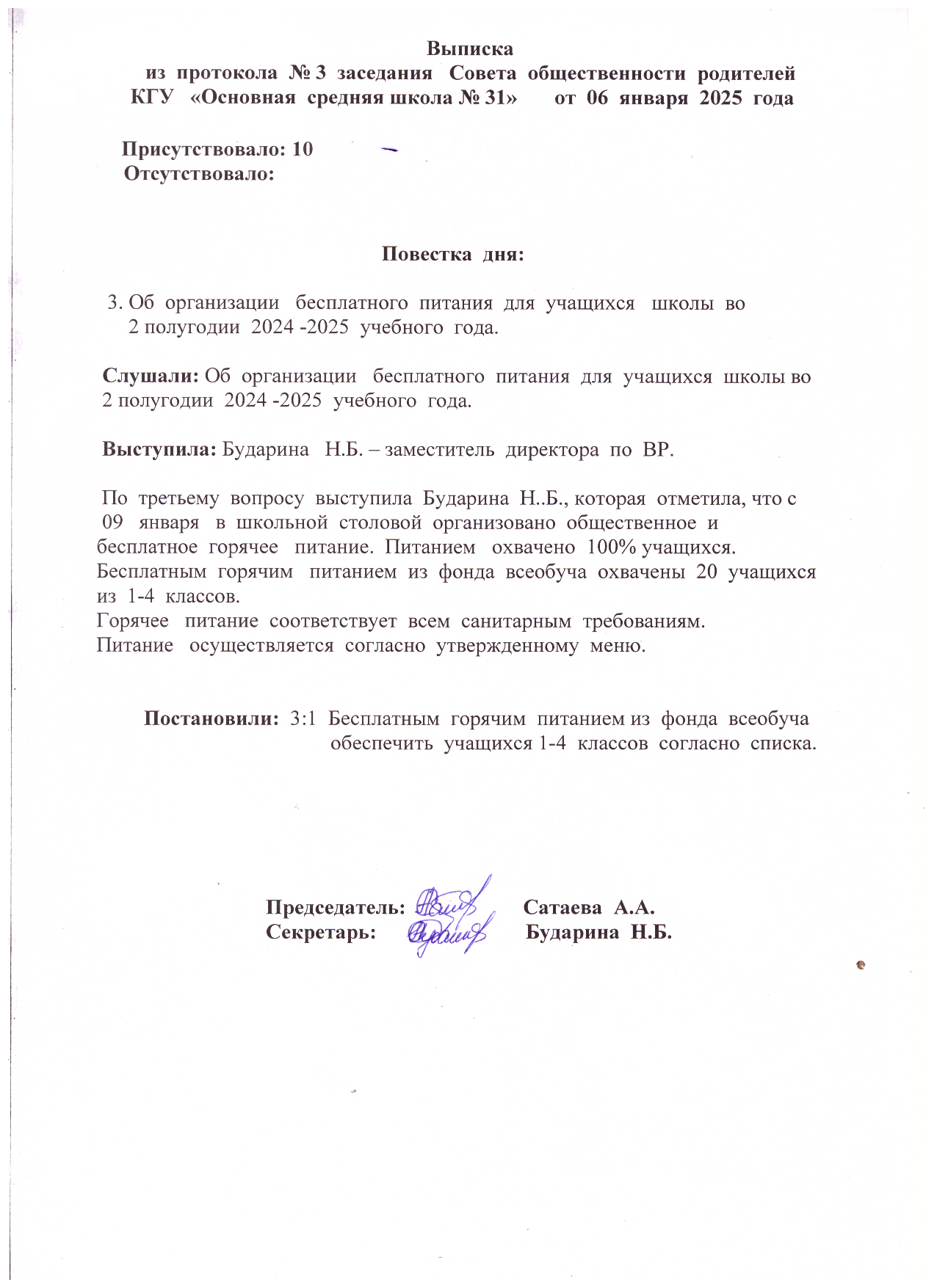 выписка из протокола №3 заседания Совета общественности родителей от 06.01.2025 года каз