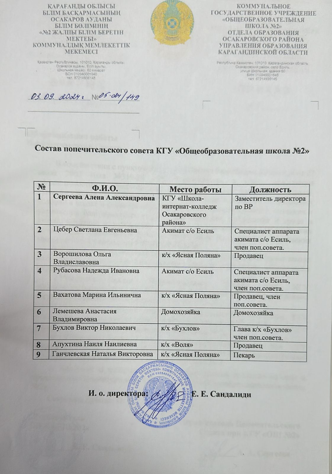 Приказ о создании Попечительского совета в организациях общего среднего образования Осакаровского района. |