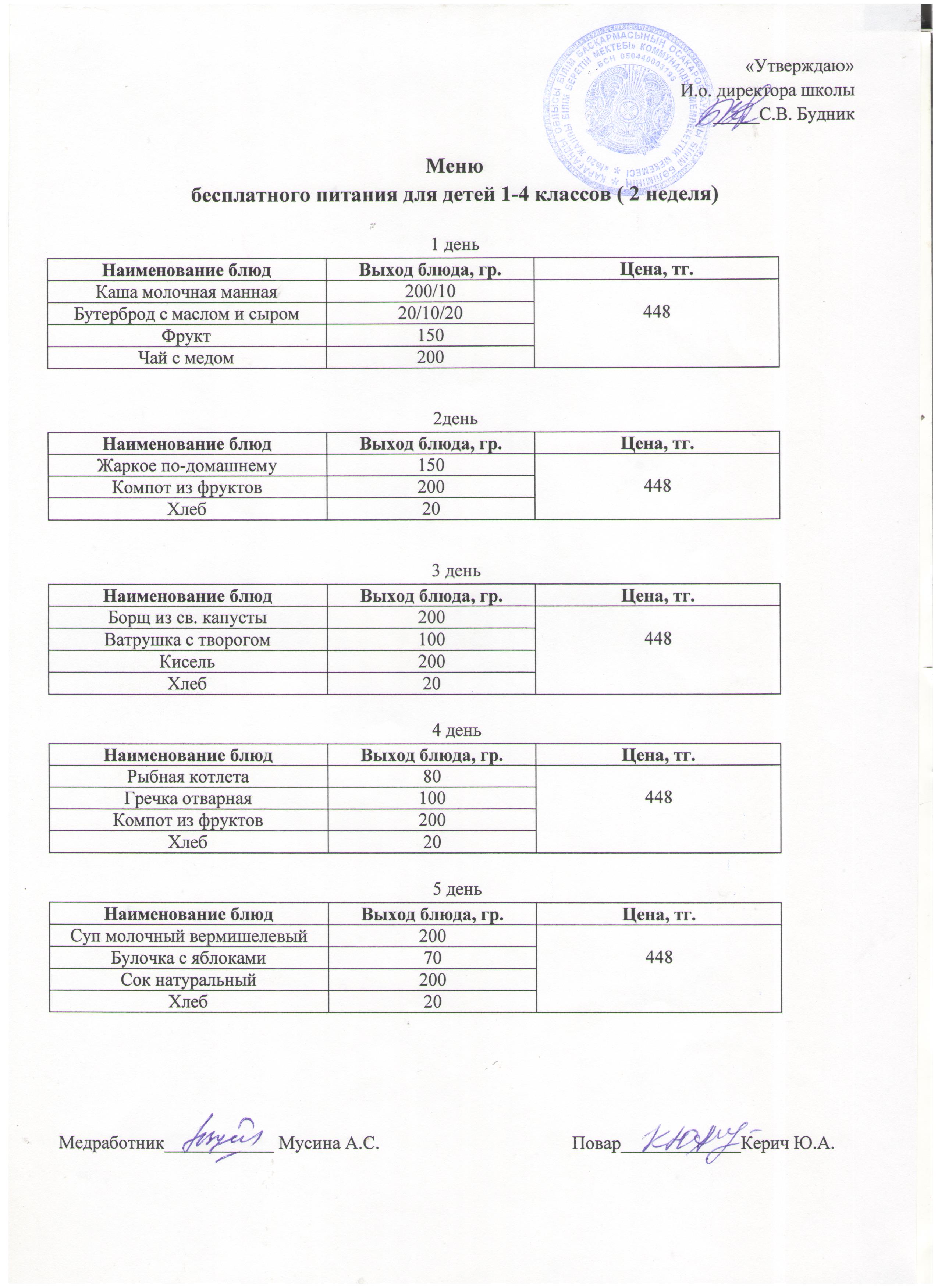 Меню бесплатного питания 1-4 кл. 2 неделя. |
