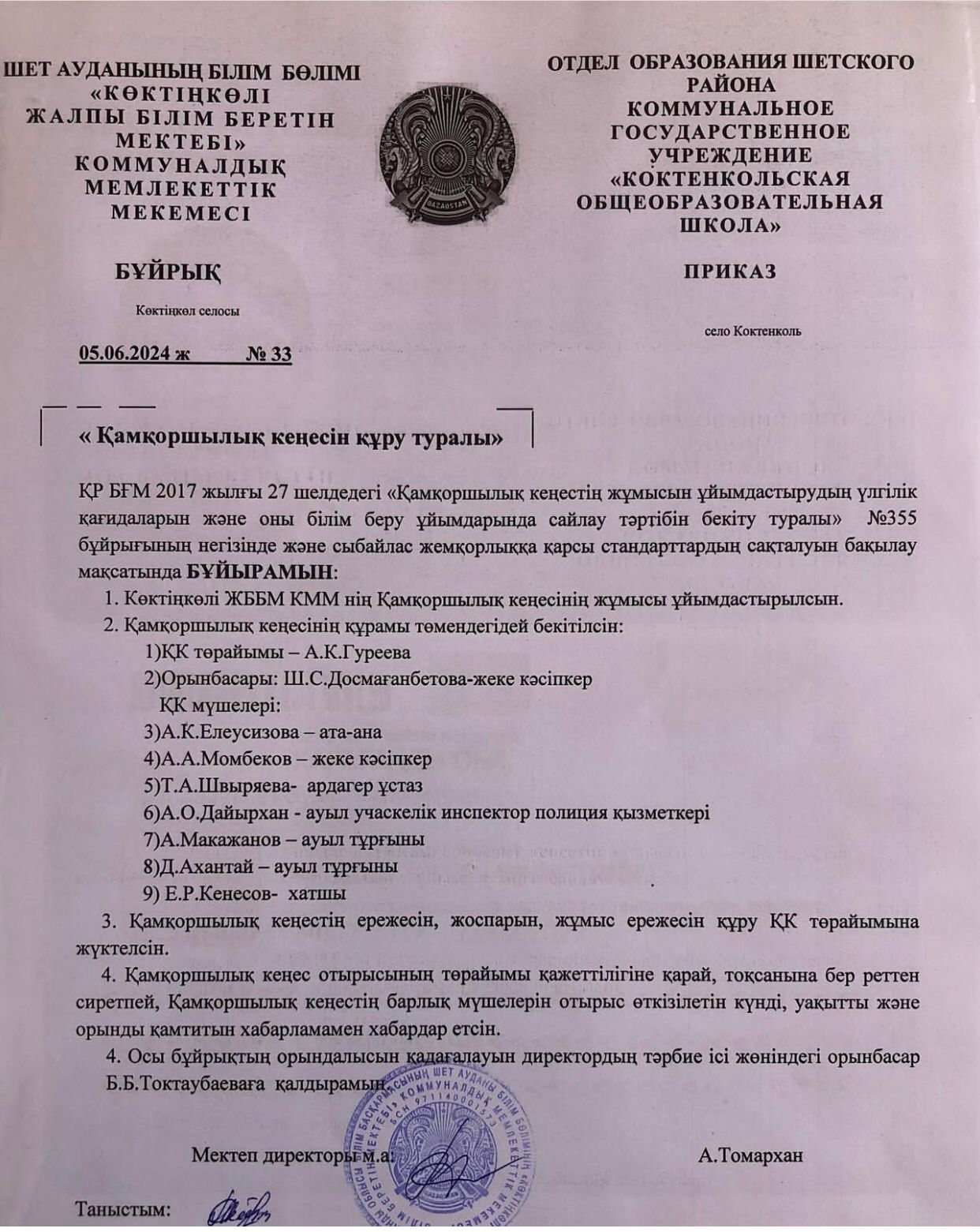 Қамқоршылық кеңесінің құру туралы бұйрығы