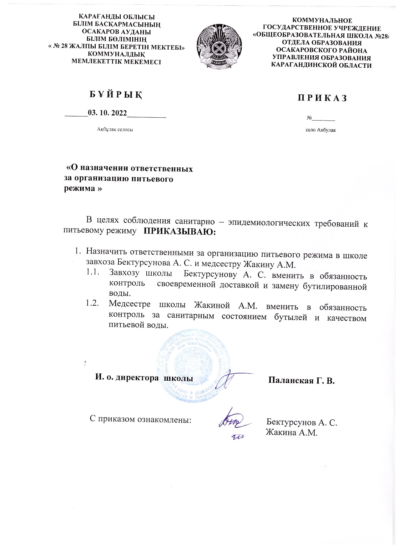 Приказ о назначении ответственных за организацию питьевого режима. |