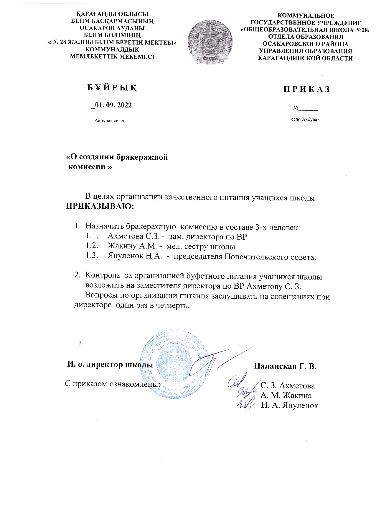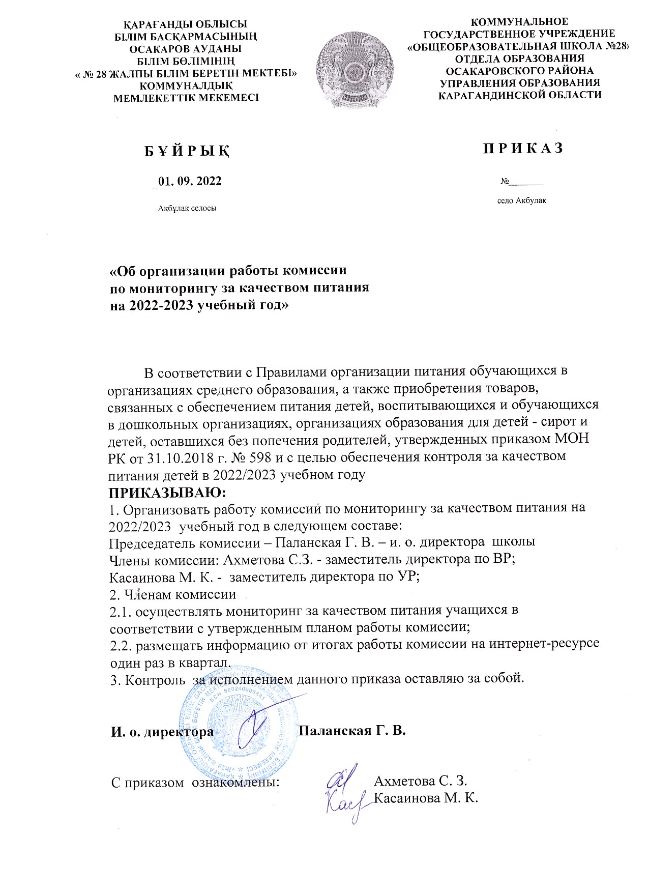Приказ об организации работы комиссии по мониторингу за качеством питания на 2022 - 2023 учебный год. |