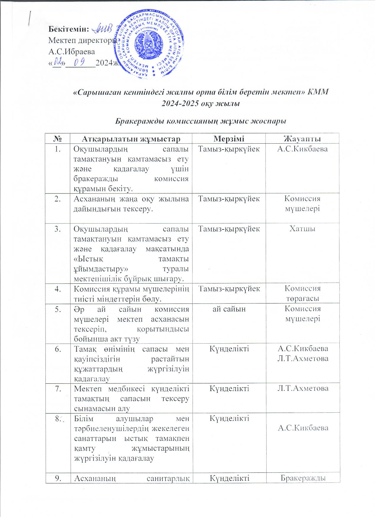 Мектепте буфеттік жүйедегі тамақтандыру жұмыстары ұйымдастырылған: тағам дайындау, ыстық тамақ әзірлеу, буфеттік зиянсыз өнімдер. Мектеп асханадағы тамақтануды ұйымдастыру кезінде Қазақстан Республикасы Бас мемлекеттік санитарлық дәрігерінің 2020 жылғы 25 желтоқсандағы №67 қаулысымен бекітілген мектеп асханалары қызметінің тәртібіне қойылатын талаптары қатаң сақталынуда. Оқу жылының басында ата-аналар қоғамы мен мектеп әкімшілігі қатарынан бракераждық комиссия құрылды.