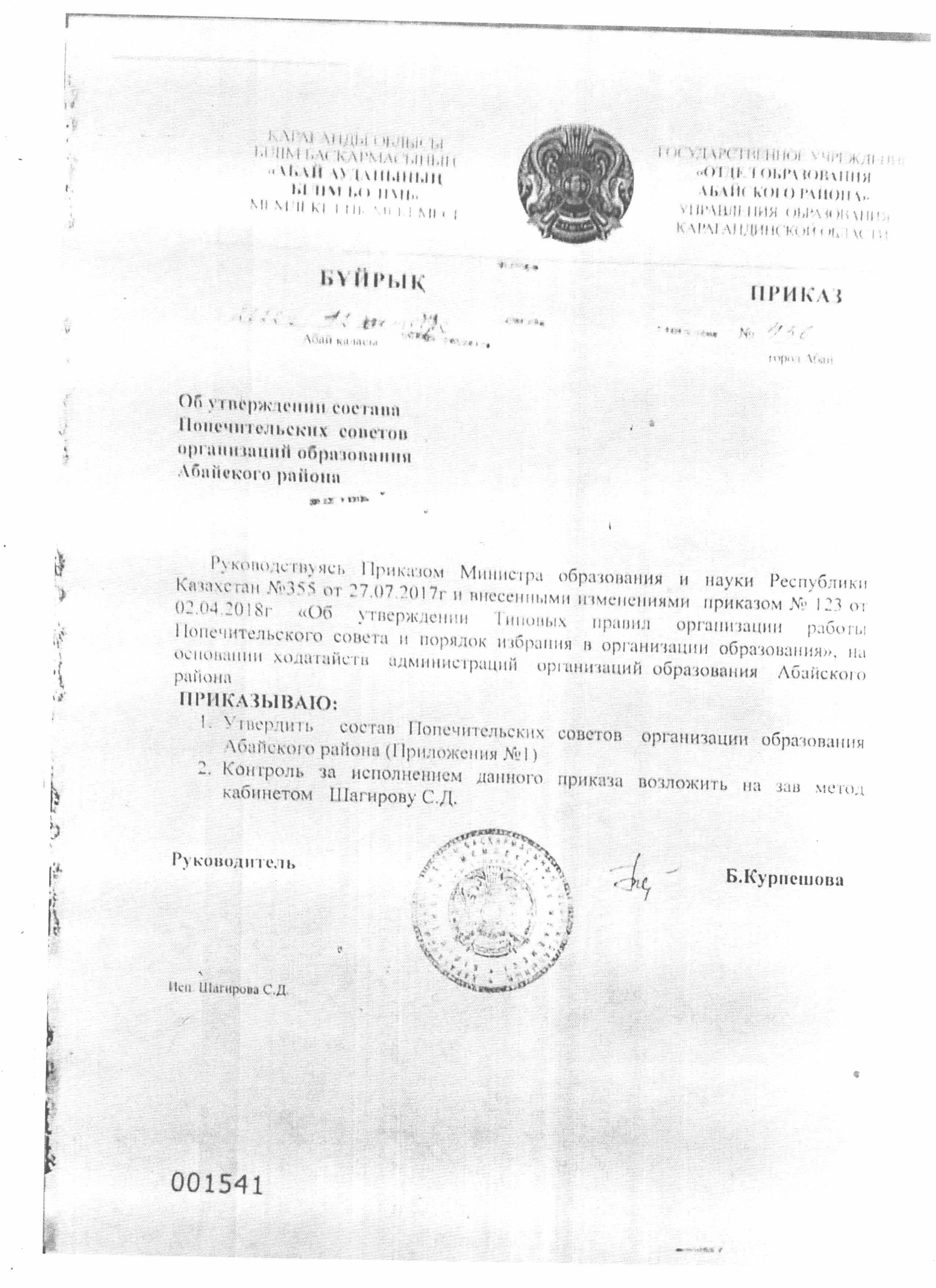 Абай ауданының білім беру ұйымдарының қамқоршылық кеңесінің құрамдарын бекіту туралыАбай ауданының білім беру ұйымдарының қамқоршылық кеңесінің құрамдарын бекіту туралы бұйрық |