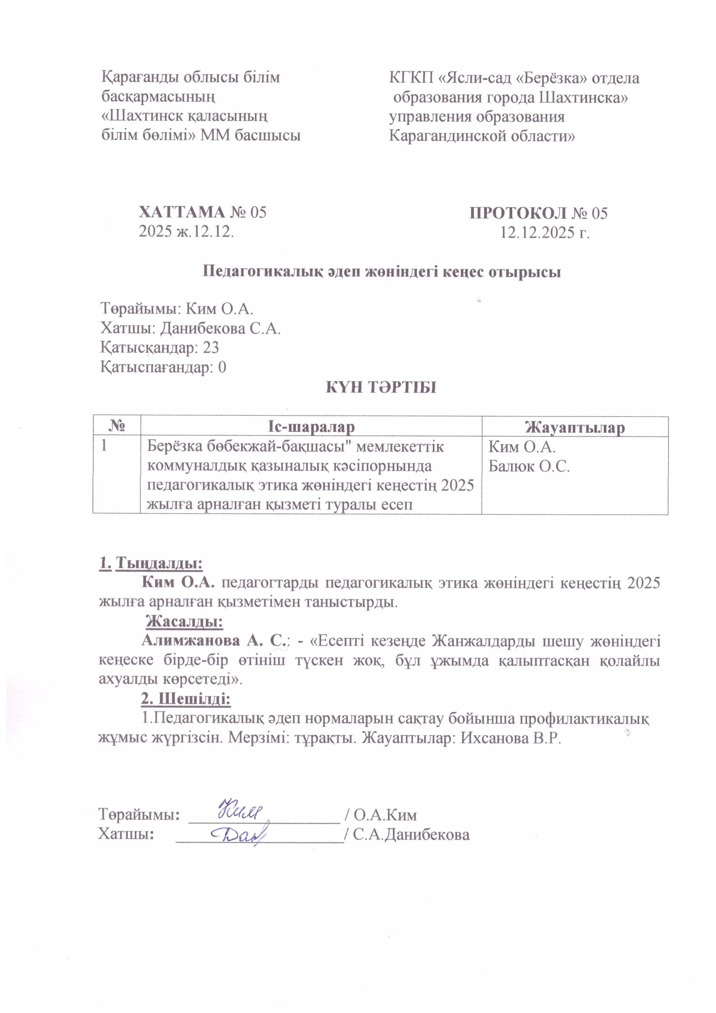 ХАТТАМА № 04 педагогикалық әдеп жөніндегі кеңестің отырыстары ХАТТАМА № 04 |