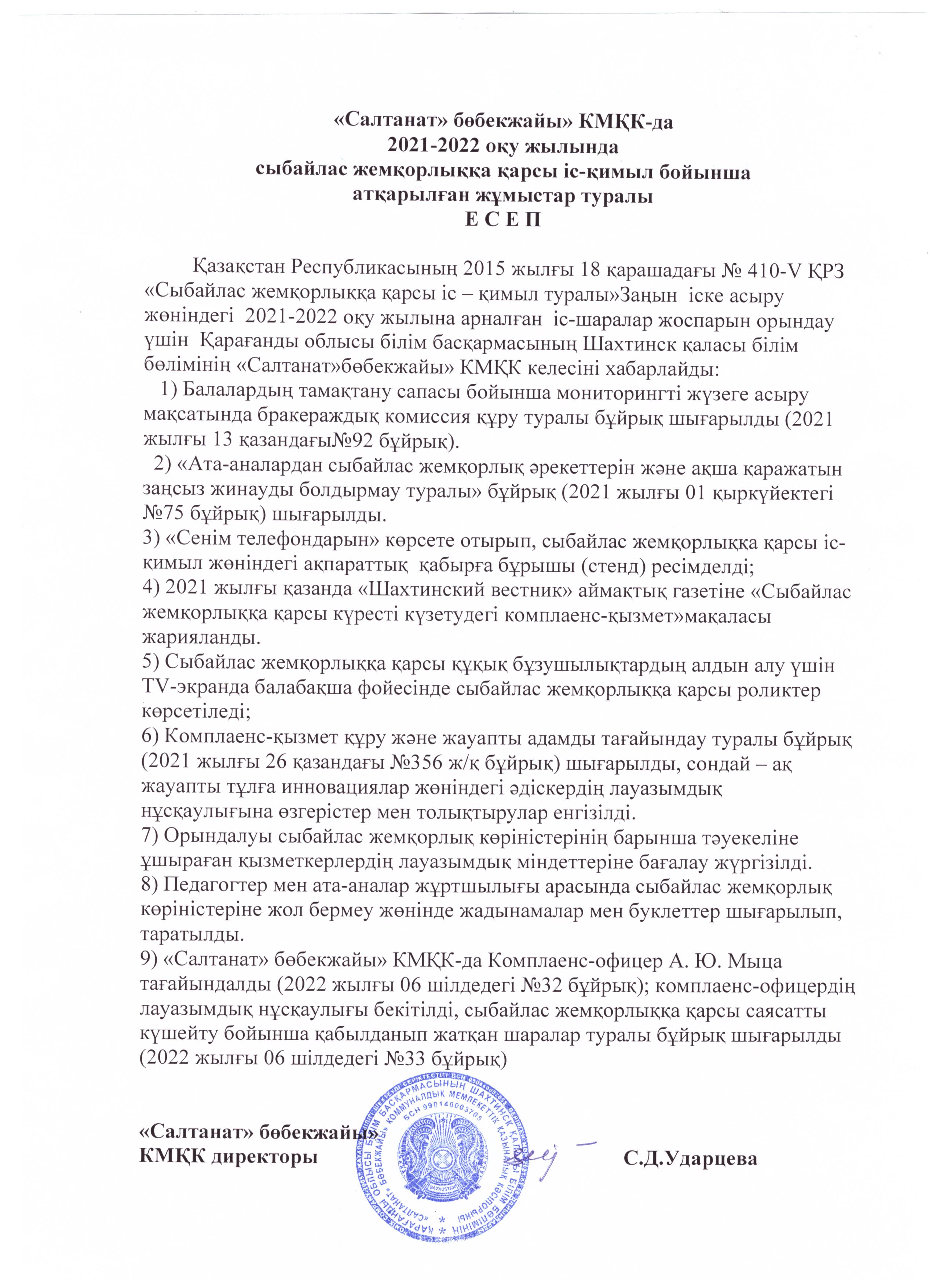 сыбайлас жемқорлыққа қарсы іс-қимыл«Салтанат» бөбекжайы»КМҚК жоспары |