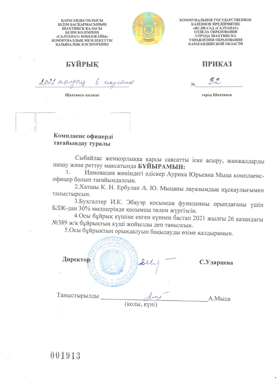Комплаенс-офицерді тағайындау туралы бұйрықКомплаенс-офицердің лауазымдық нұсқаулығы |