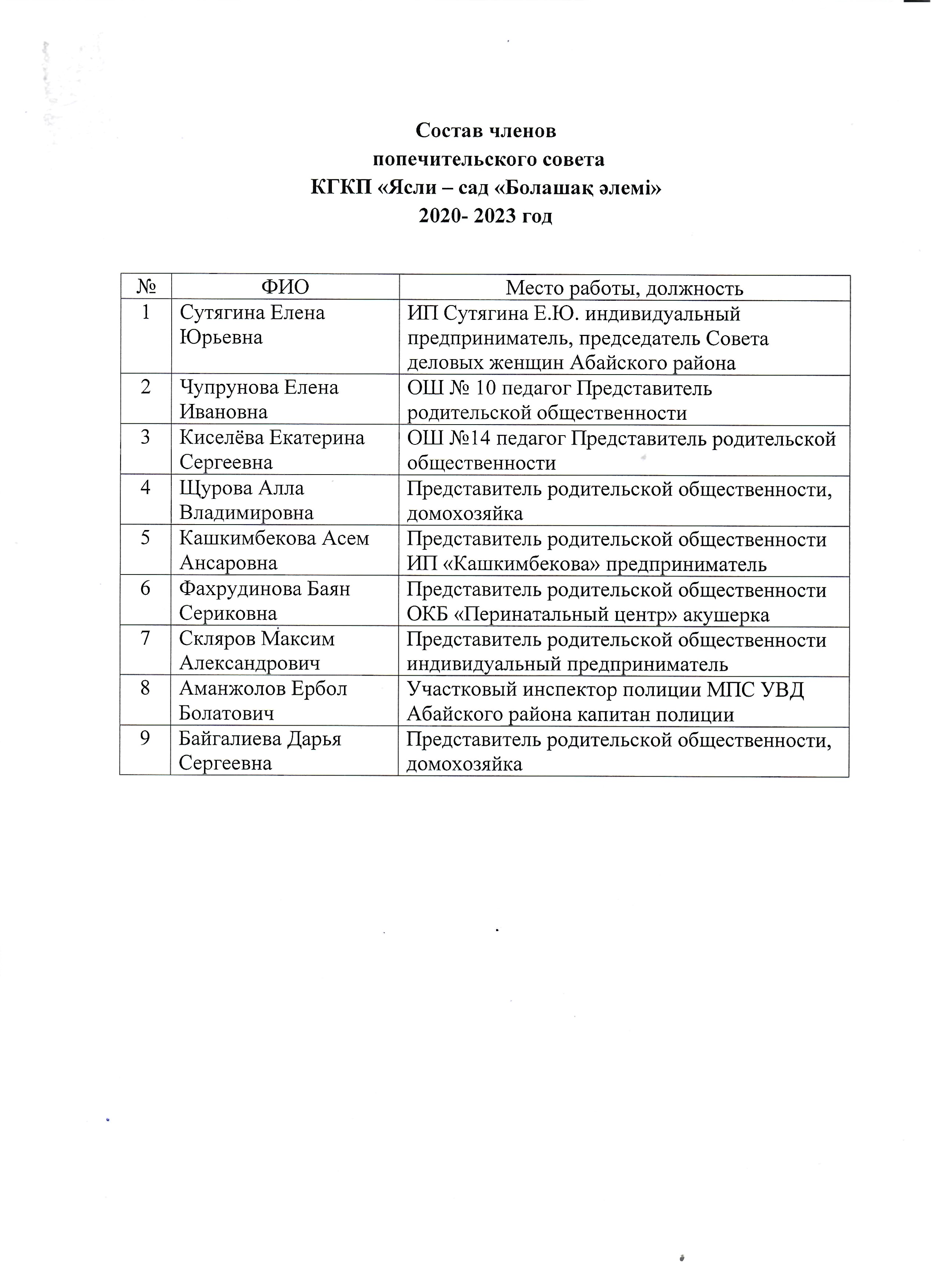 Состав членов Попечительского совета. Декабрь 2020год