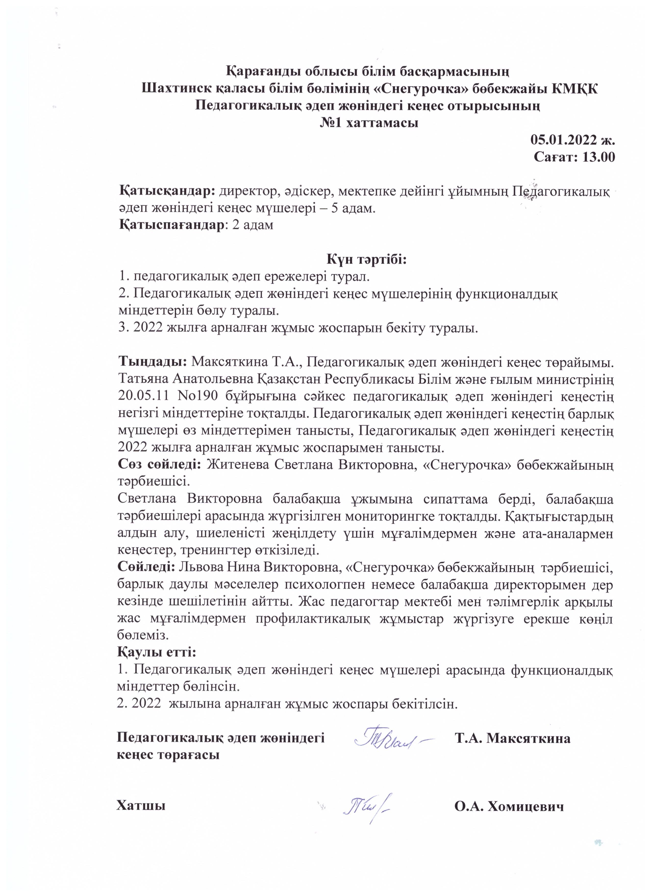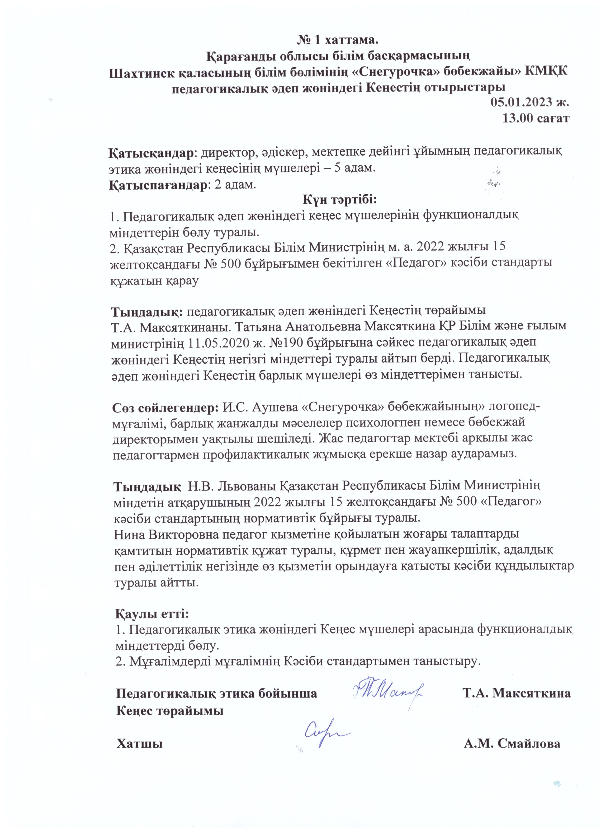 Педагогикалық әдеп жөніндегі кеңес отырысының №1 хаттамасы05.01.2022 |