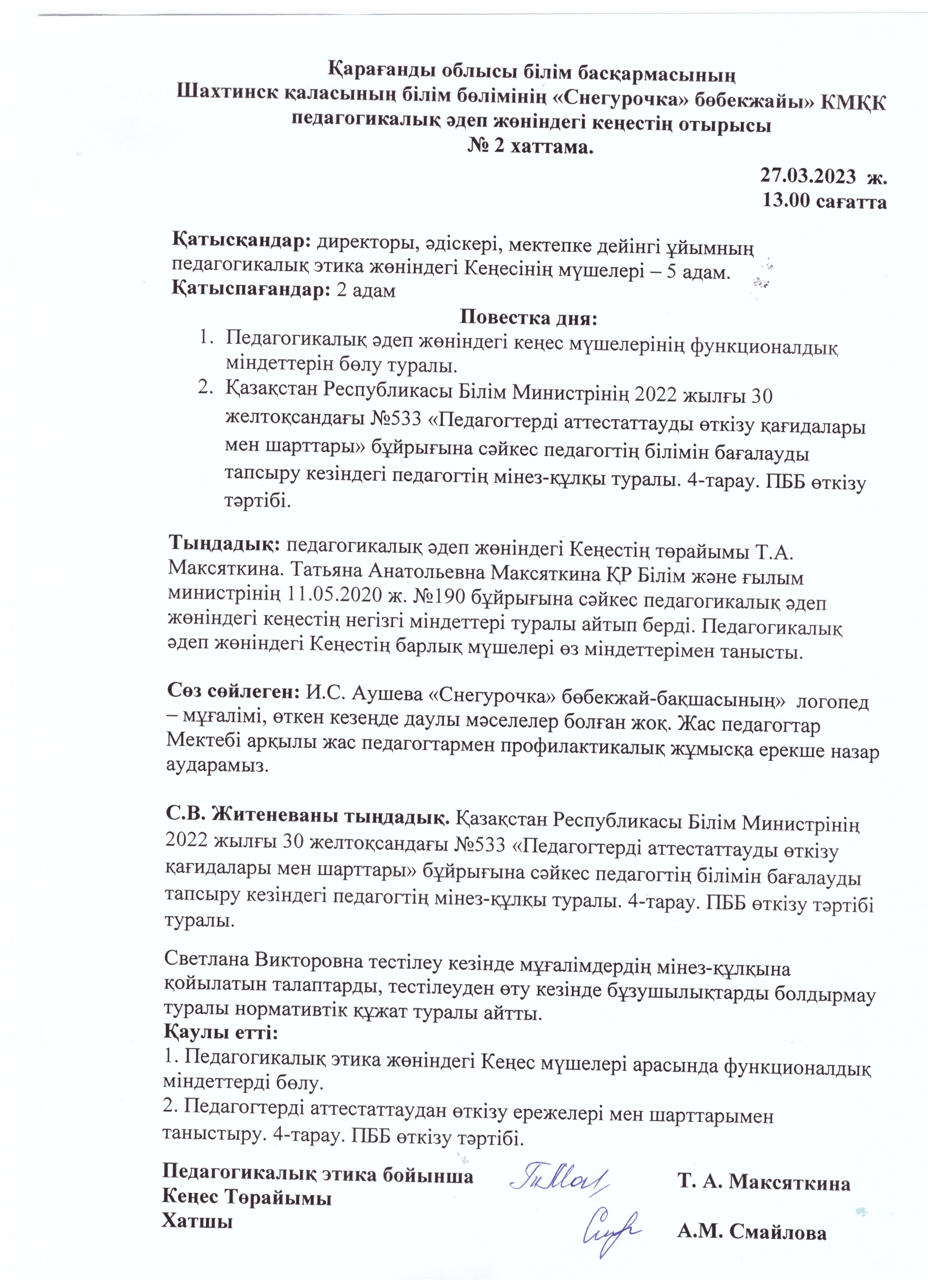 Педагогикалық әдеп жөніндегі кеңес отырысының №2 хаттамасы27.03.2023 |