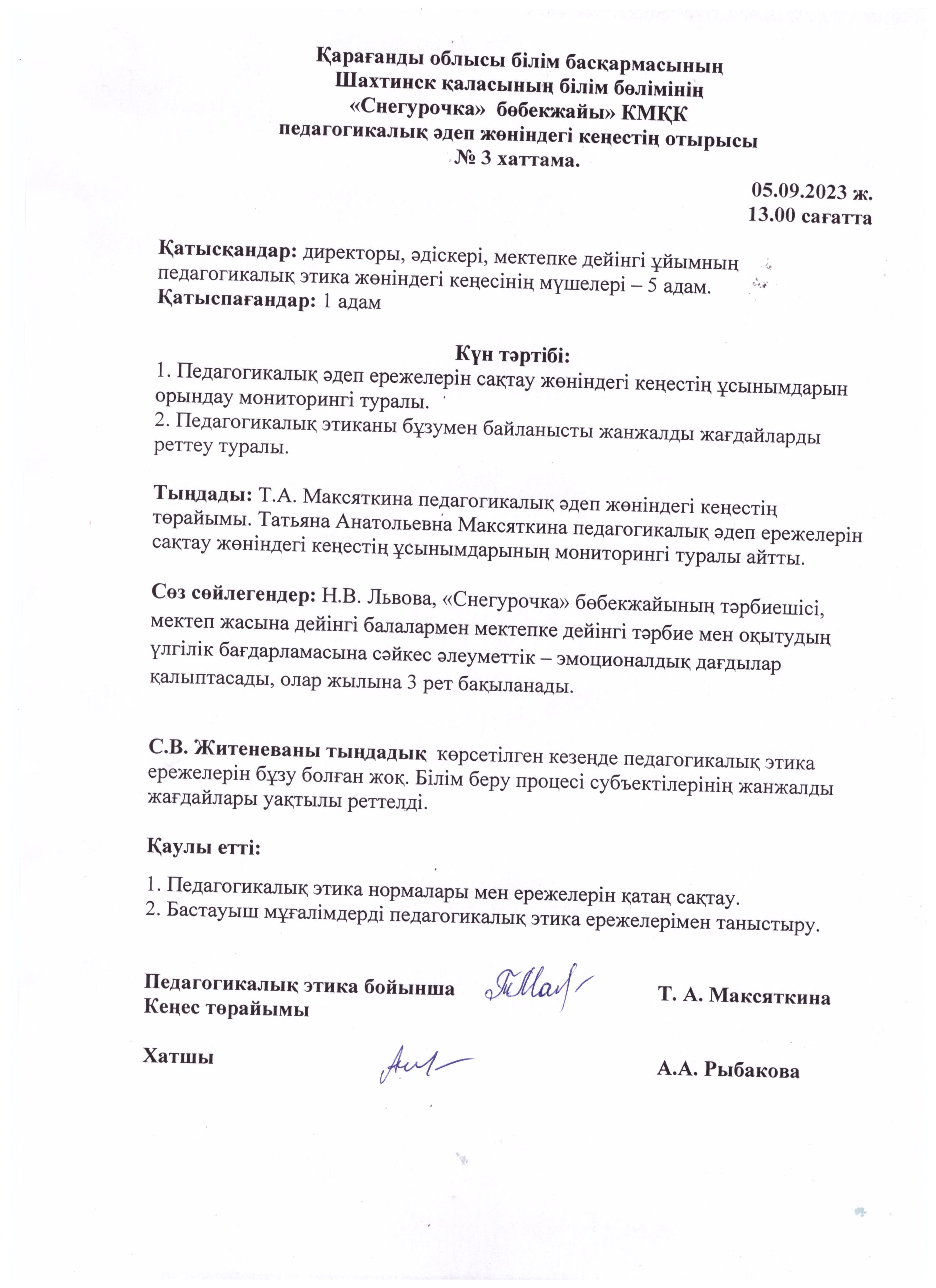 Педагогикалық әдеп жөніндегі кеңес отырысының №3 хаттамасы05.09.2023 |