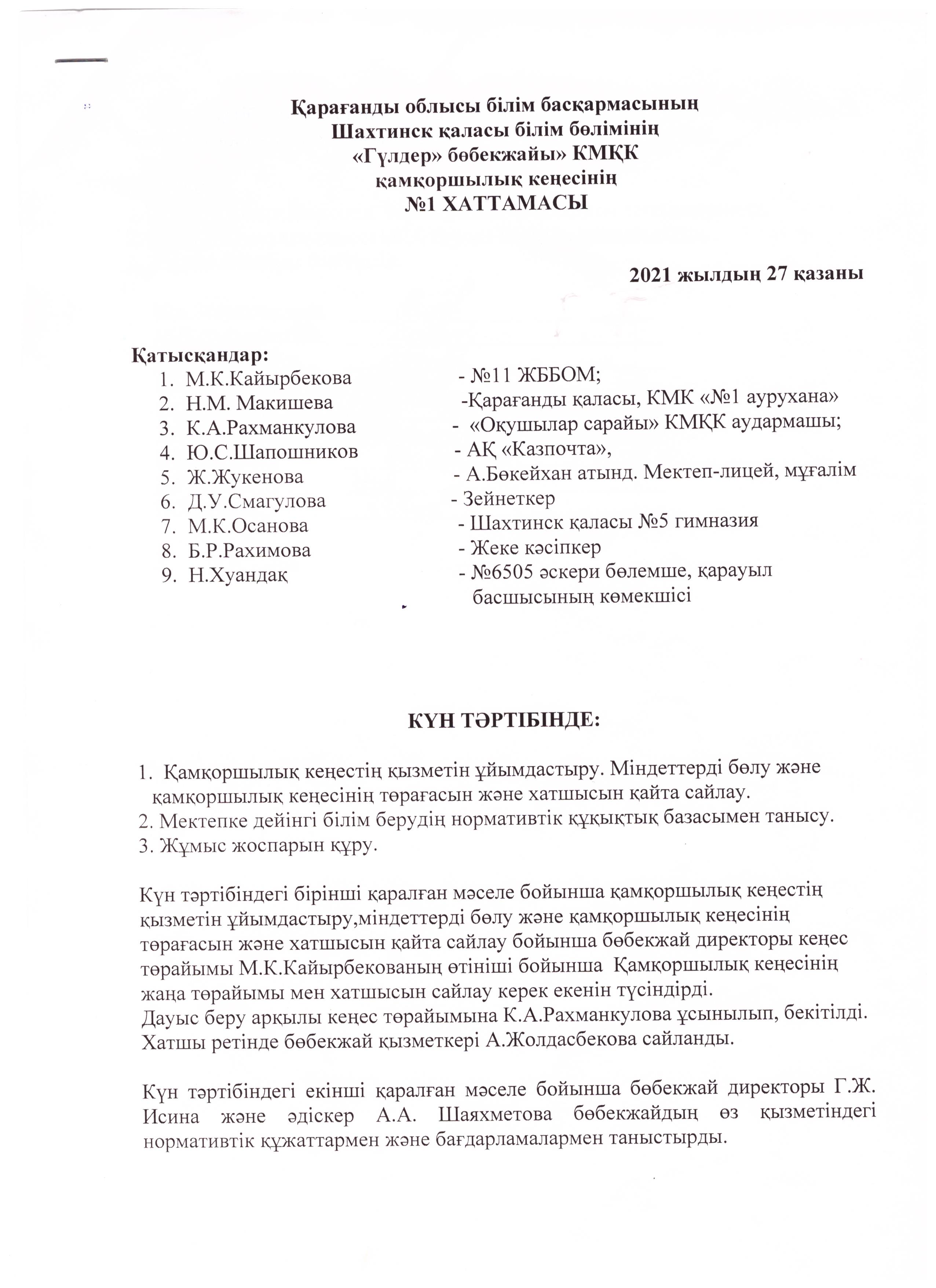 2021 жылғы 27 қазандағы №1 хаттама