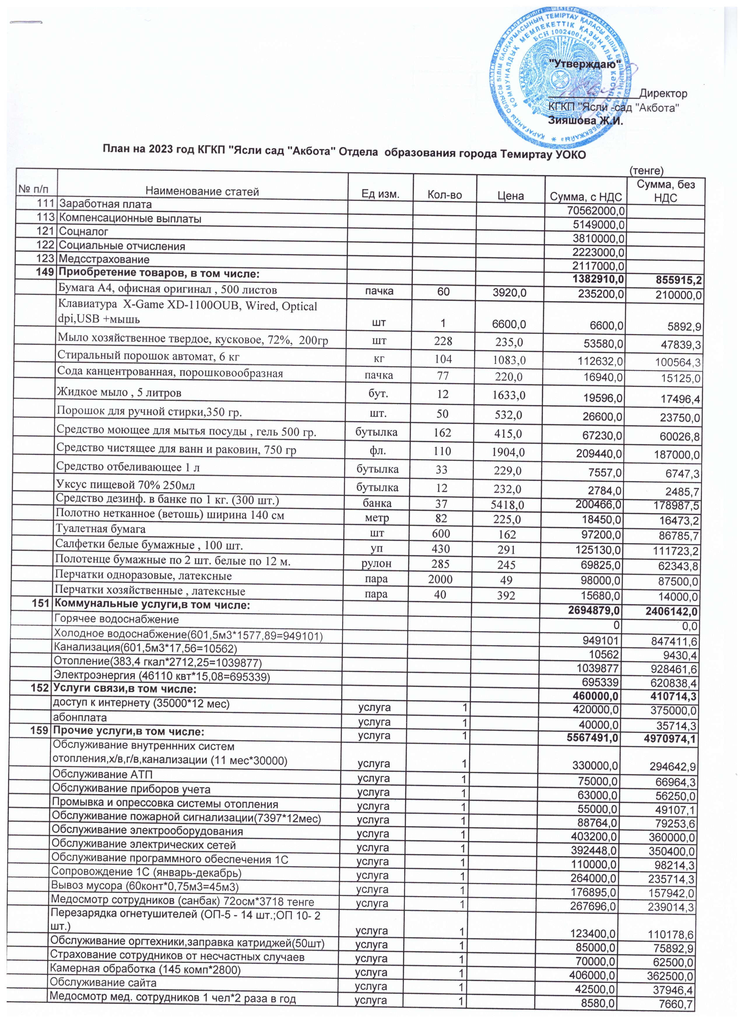 План на 2023 год КГКП "Ясли-сад" Ақбота" Отела оброзования города Темиртау УОКО |