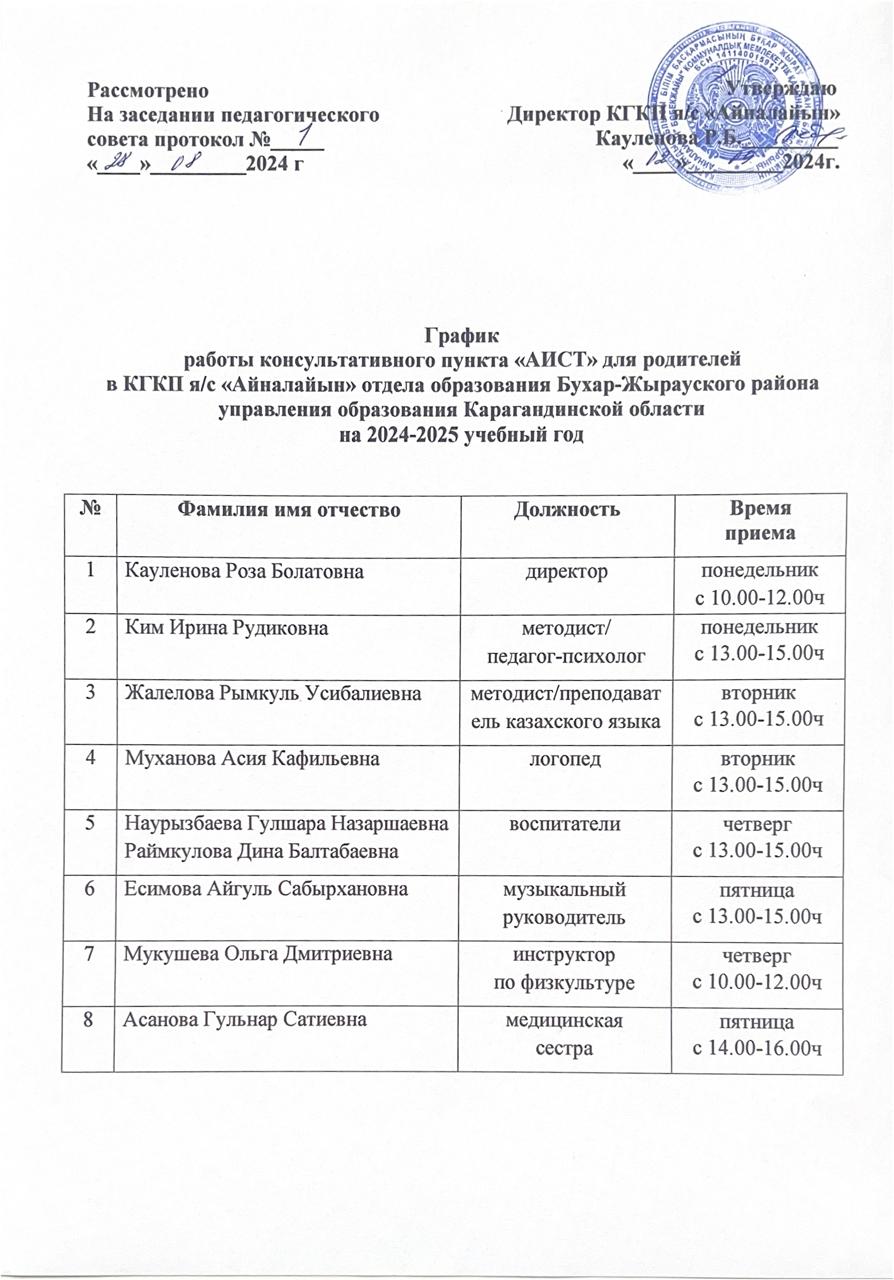 График работыконсультативного пункта "АИСТ" для родителей, дети которых не охвачены дошкольным воспитанием и обучением на 2024-2025 учебный год |