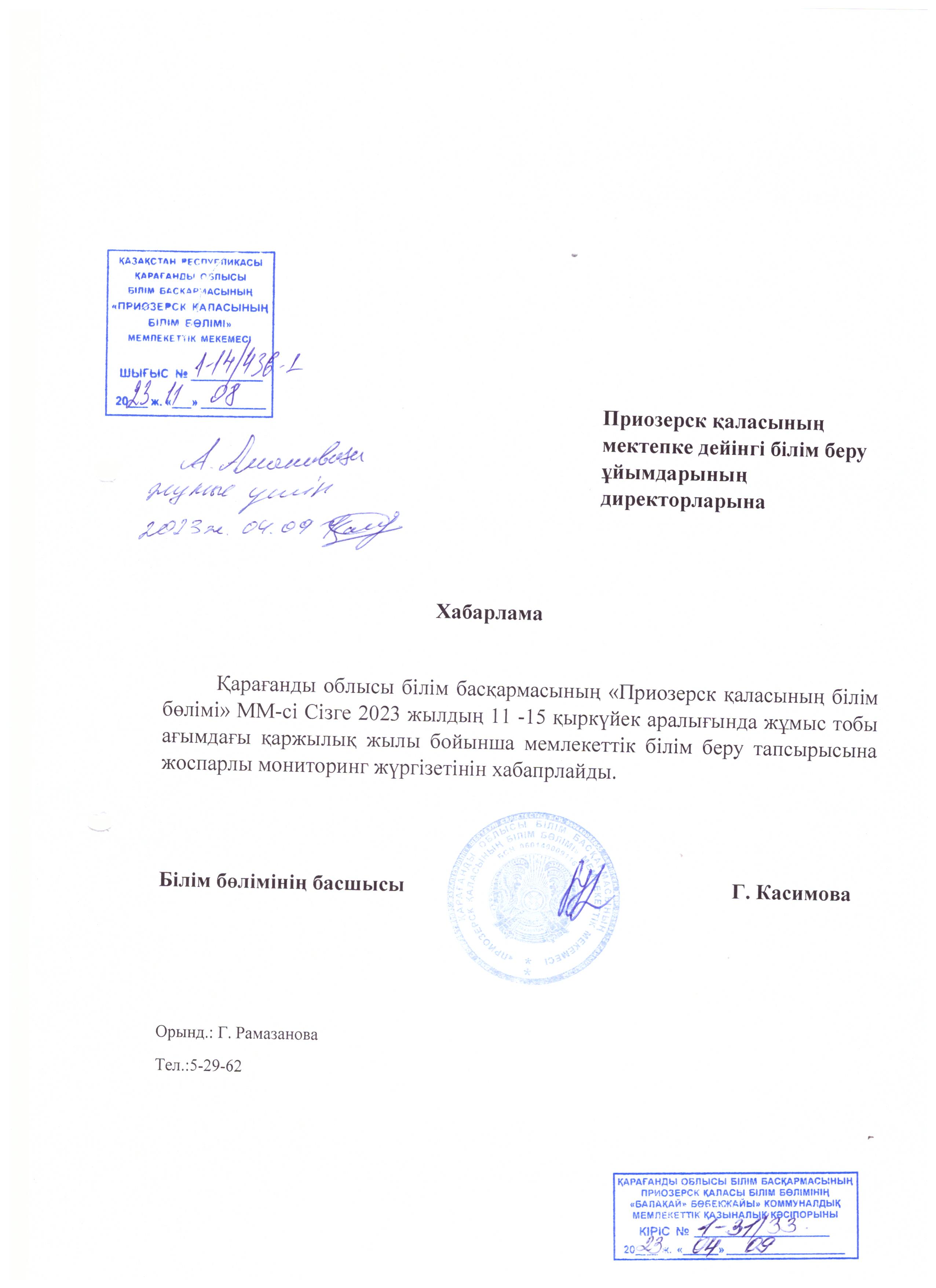 2023 жылдың 11-15 қыркүйек аралығында жұмыс тобы ағымдағы қаржылық жылы бойынша мемлекеттік білім беру тапсырысына жоспарлы мониторинг жүргізілетінін хабарлайды.